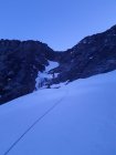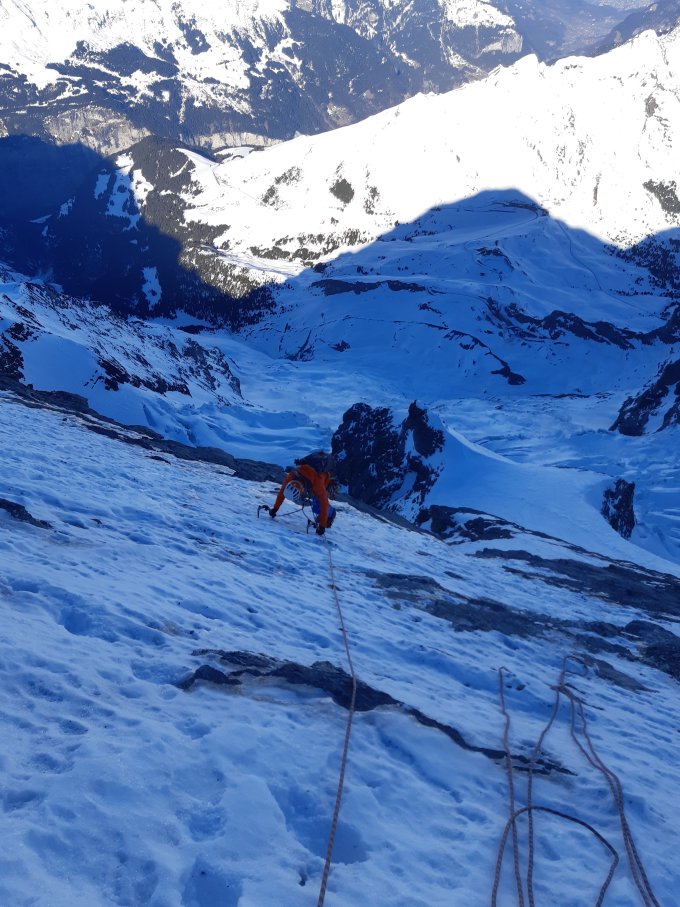 Danach sind die Platten teils mit einer Mischung aus Tritt-, Hart- und Pulverschnee und einer Eisglasur bedeckt. Dies war sehr unangenehm zu klettern und Sicherungsmöglichkeiten sind recht beschränkt. Wir stiegen simultan auf. Schlaue Standmöglichkeiten gibt es eh nicht und es ist grundsätzlich nicht sehr schwer. Unsere Linienwahl war einer diagonalen Schneerinne entlang links hoch bis unter die dreieckigen Felsen. Danach horizontale Querung nach rechts und um die Felsen herum auf die Gneisrippe. Dies ist von der Station Eigergletscher aus gut erkennbar.