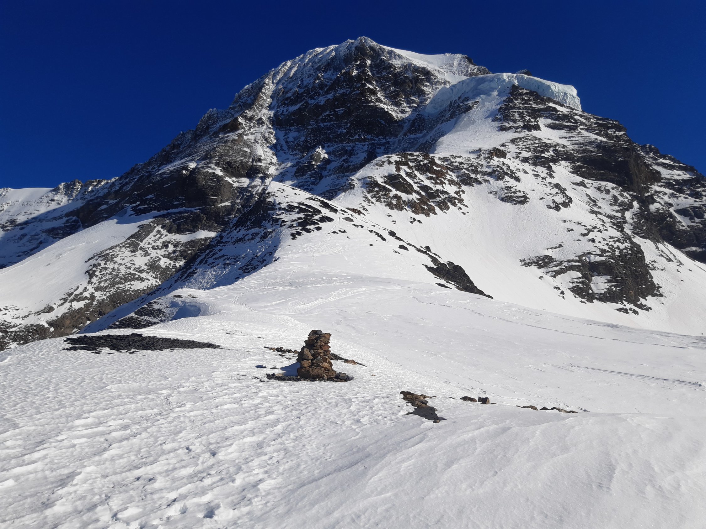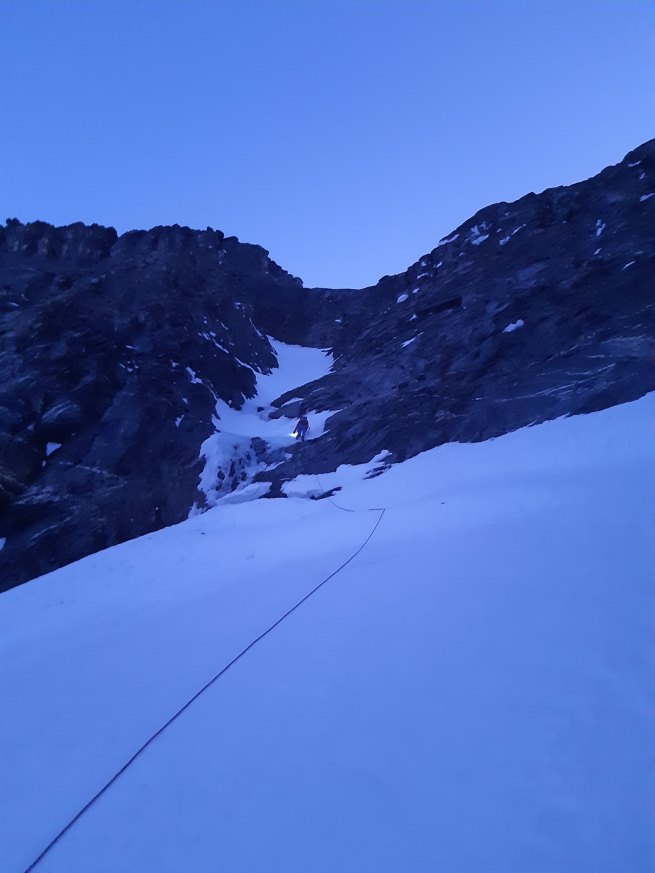 Die Gneisrippe lässt sich gut klettern. Es gibt einzelne Trittschneepassagen dazwischen. Der Ausstieg auf den Grat ist ebenfalls im Schnee mit einigen kurzen Blankeisstellen. Nach einigen Metern auf dem Grat gingen wir Seilfrei in gutem Trittschnee zum Gipfel. Abstieg über Normalroute auf guter Spur.