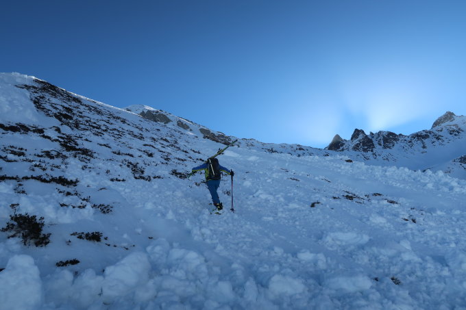 Im Aufstieg alles hart. Bei P. 2002 sind alle Hänge heruntergekommen und der Lawinenkegel musste überwunden werden, was zu Fuss nötig war. Anschliessend bis unterhalb der Schlüsselstelle ohne Harscheisen. Aufstieg bis zur Schlüsselstelle mit Harscheisen. Kurze Kletterstelle II überwunden und weiter auf das Platteau. Ab dort weiter ohne Harscheisen bis zum Joch. Danach Fussaufstieg über den Grat zum Gipfel. Die Abfahrt machten wir über die südliche Seite zurück zur Schlüsselstelle. Diese konnten wir an geeigneter Stelle mit den Ski abfahren (Steil). Die restliche Abfahrt entlang der Aufstiegsroute.
