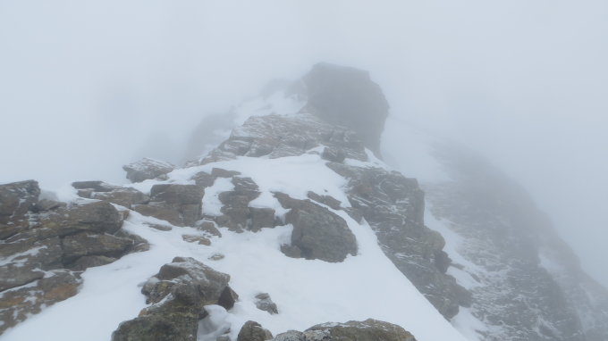 Wir hatten an diesem Tag sehr dichten Nebel. Von der Tuoi Hütte sind wir um 8 Uhr los über den Sattel nach Österreich und von dort zum Skidepot traversiert. Es war alles Hartschnee und die Traverse forderte die Aufmerksamkeit an die Skikanten. War aber denn gut machbar. Die Spuren zum Gipfel war vom Wind zugeweht und wir konnten aufgrund des Nebels auch nichts richtig erkennen, was den Aufstieg sehr interessant machte. Oben auf dem Gipfel brach dann plötzlich der Nebel auf und wir hatten noch eine recht gute Aussicht. Wir sind dann von dort weiter auf dem Piz Jeramias.