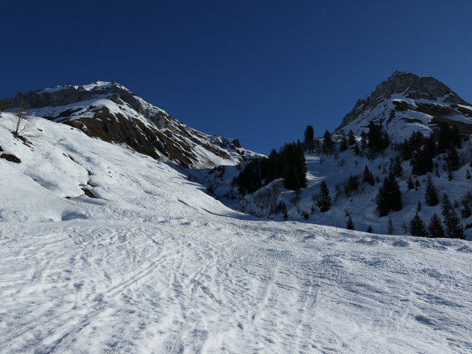 Die Abfahrt ins Silbertälli (stellenweise bis zu 40° steil im oberen Stück) ist pistenartig, hart und sehr gut zu fahren.