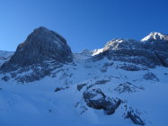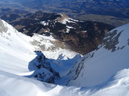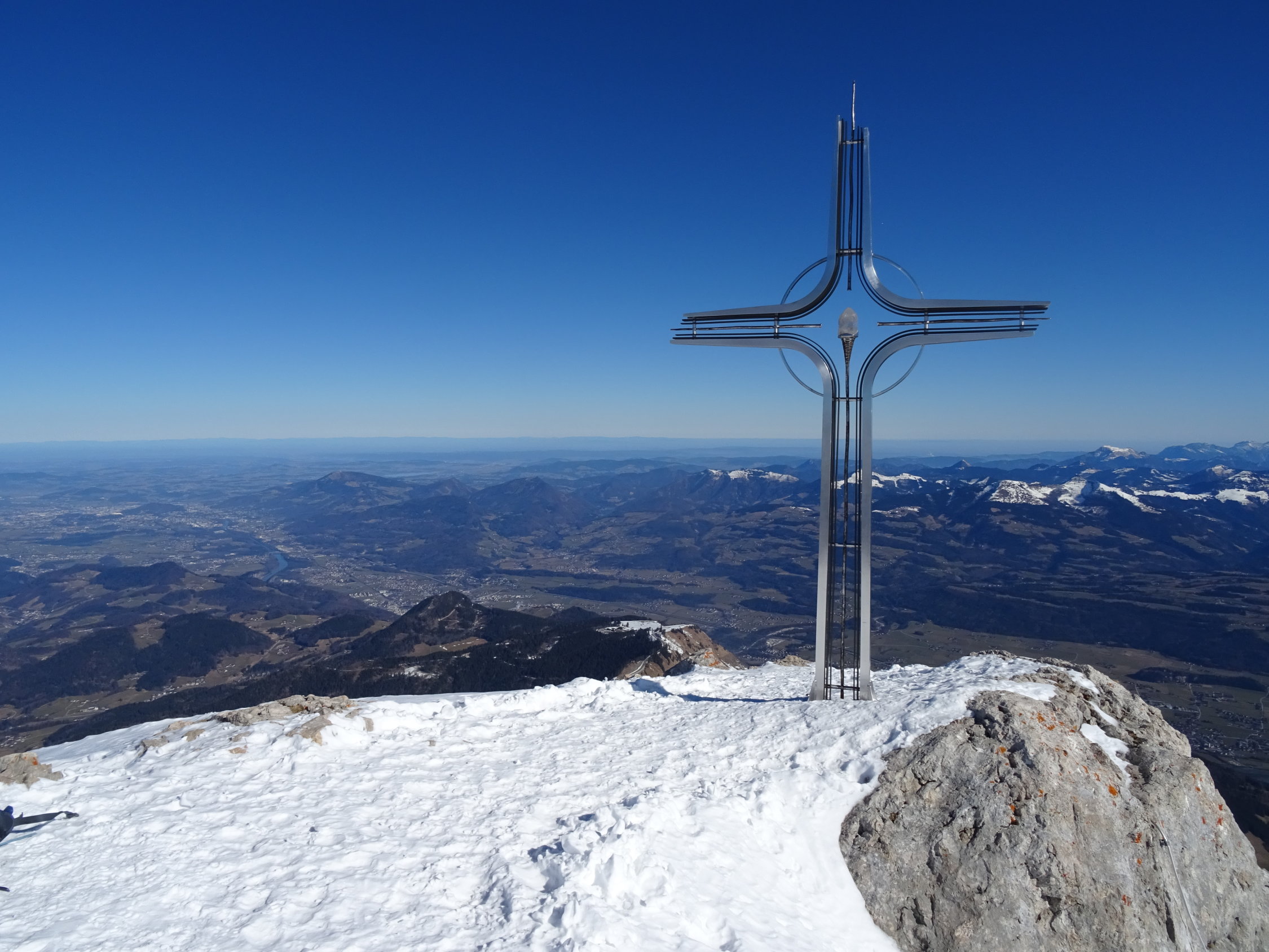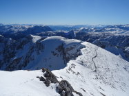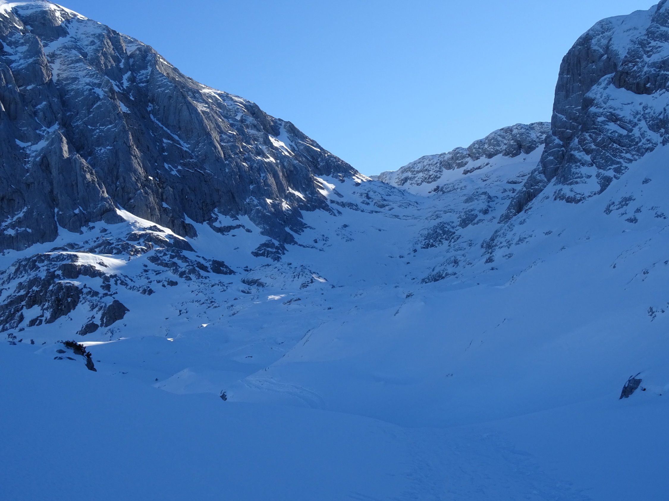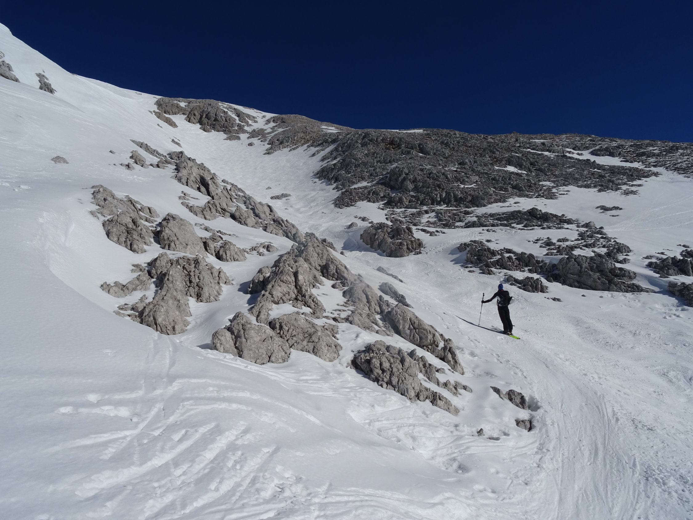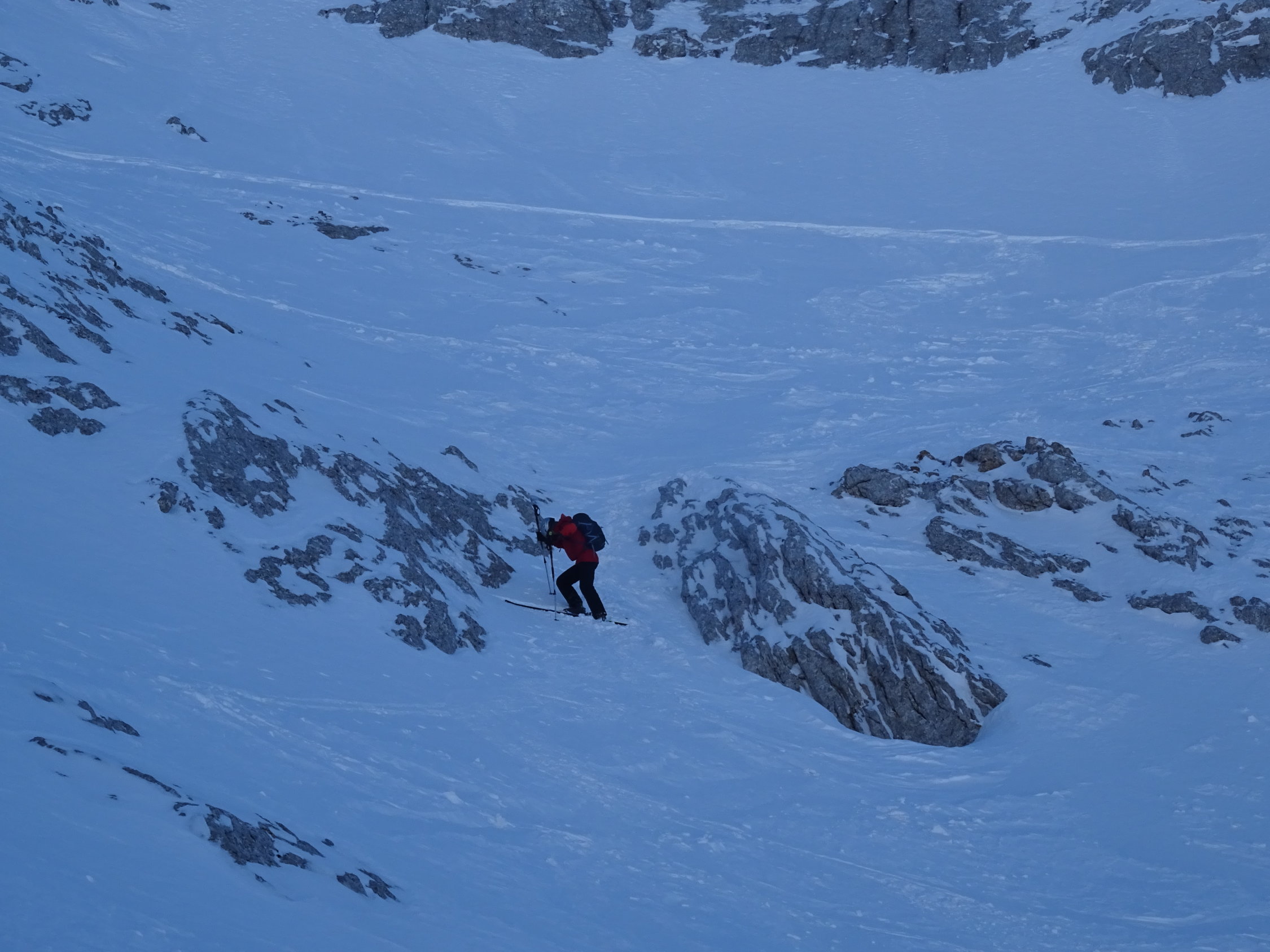 vom Parkplatz ca. 30min Ski Tragen über die Fixseile hinweg und noch weiter hinauf bis zur ersten Engstelle; Schnee ab kurz unterhalb der Engstelle; oberhalb dieser gehts sehr eisig weiter durchs Alpeltal; erst in den Umgäng gute Spur; den Südhang zum Vorgipfel hoch entweder durch die Schneerinne oder zu Fuß am fast schneefreien, steinigen Grat; insgesamt schauen viele Steine raus und wenig Schnee, aber man kommt schon (noch) ohne größere Schäden rauf und runter; tolle Gipfelsicht heute! danach noch zum Hohen Brett rauf; hier war die Spur verweht und windverpresster Pulver, in der Abfahrt aber der beste Schnee für heute! eine Engstelle vorhanden, wo man kurz zu Fuß raufstapft; hier danach links hoch, nicht den steilen Hang nach rechts; weiter oben sehr oft Steinkontakt, hier also aufpassen;