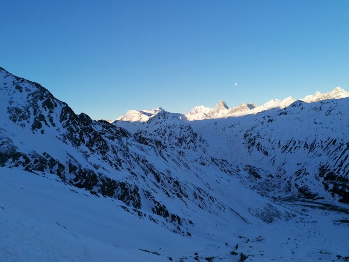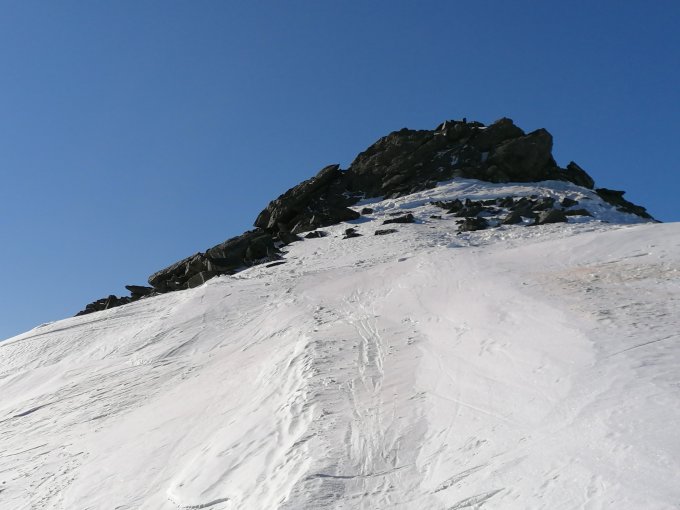 Sie bietet einen wunderschönen Blick ins Mont Blanc und auf die Südwest-Wand Couloir vom Mont Velan.