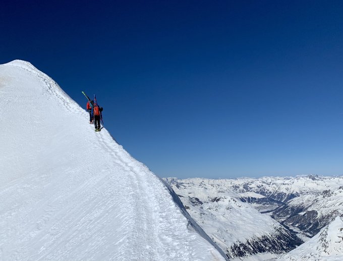 Am zweiten März waren ausgezeichnet: das Wetter, der Wind, die Lawinensituation, die Spaltenumgehung, der Trittschnee auf die Gipfel, die Schneelage bis runter nach Morteratsch, die sensationelle Fernsicht ... Gut waren der Aufstieg mit Harscheisen und gerade noch die Abfahrt im natürlich eher harten Schnee, machbar die Abfahrt von der Bergstation auf den Persgletscher, die sich anfühlt wie im Steinbruch ;-) - also für jeden was dabei, nein, es war schon ausgezeichnet, ach was, so schön, dass es weh tut.