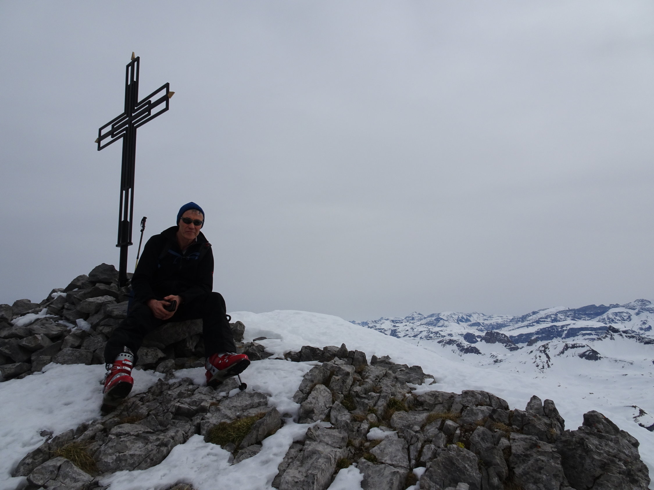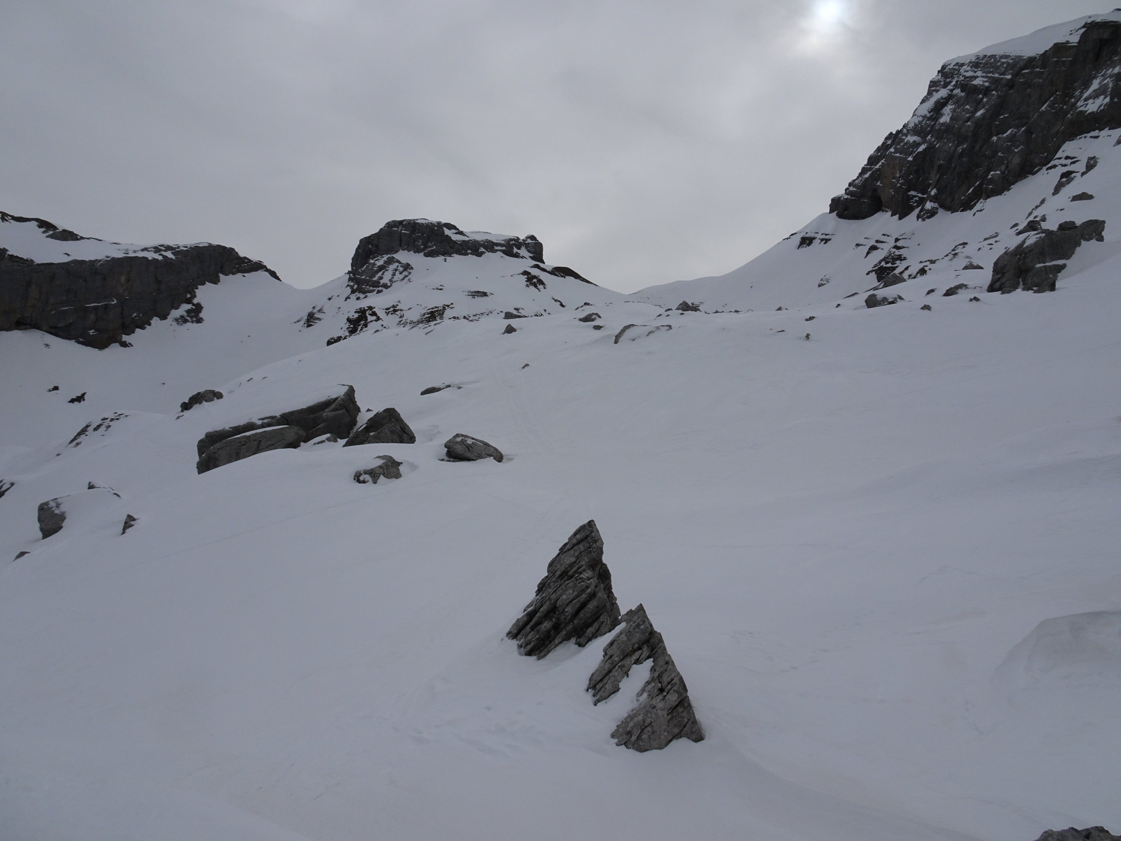 Heute eine sehr einsame Gegend um Lidernen. Weder Wetter noch Schneeverhältnisse waren toll. Aufstieg wie Abfahrt waren eher ein Chrampf. Meist ist die Schneedecke hart,eisig.Manchmal bricht sie ein. Vor allem im Aufstieg melden sich die Mukis. Der Durchstieg durchs Gipfelcouloir ist sehr hart, Steigeisen wären dienlich.
