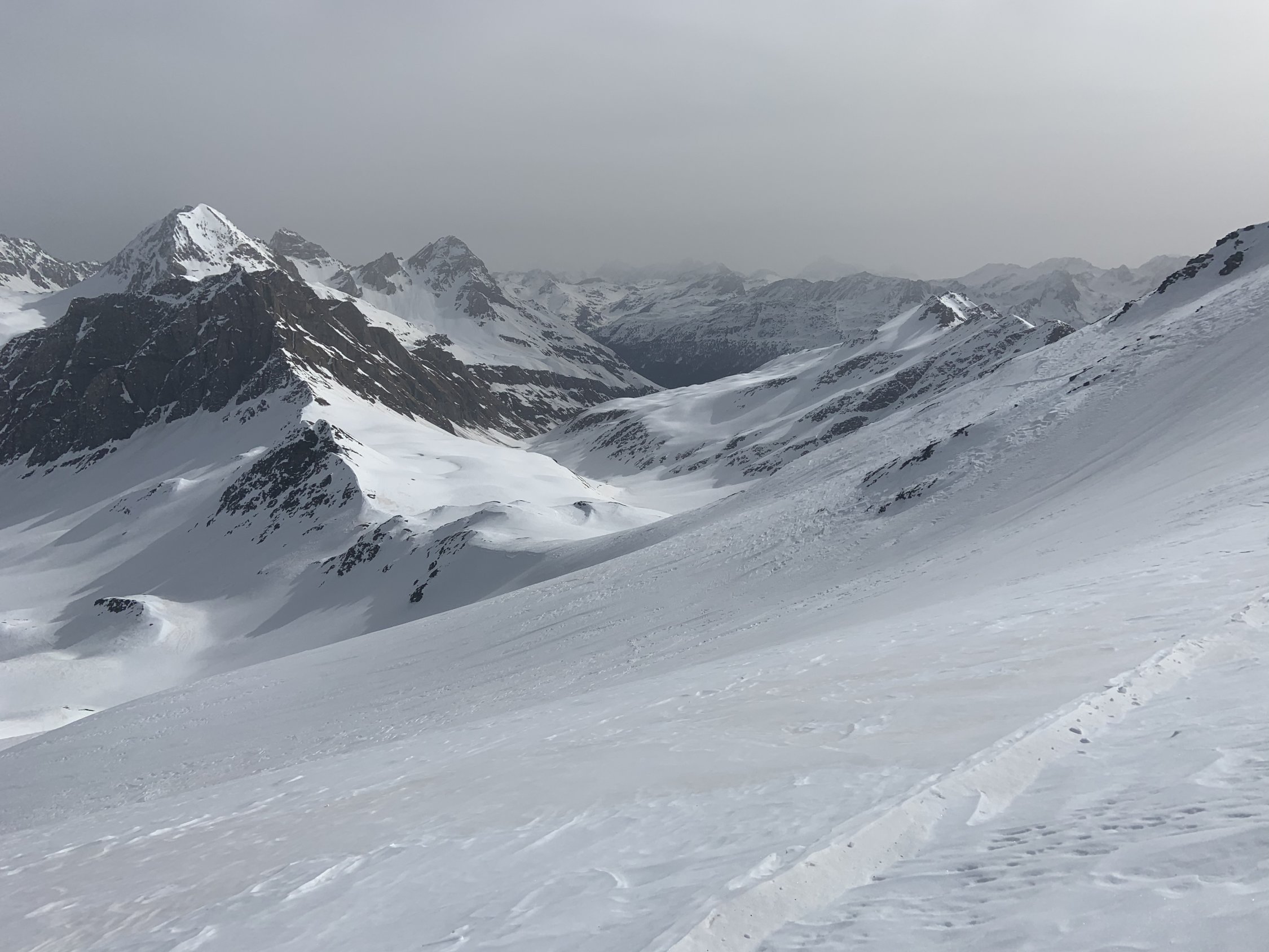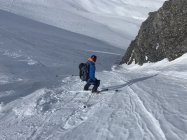 Abfahrt vom Gipfel, etwa bei Punkt 2690 nordwestlich durch ein Couloir, dann immer linkshaltend durch das lange Tal. Zum Schluss durch schönen Sulz bis nach Vals