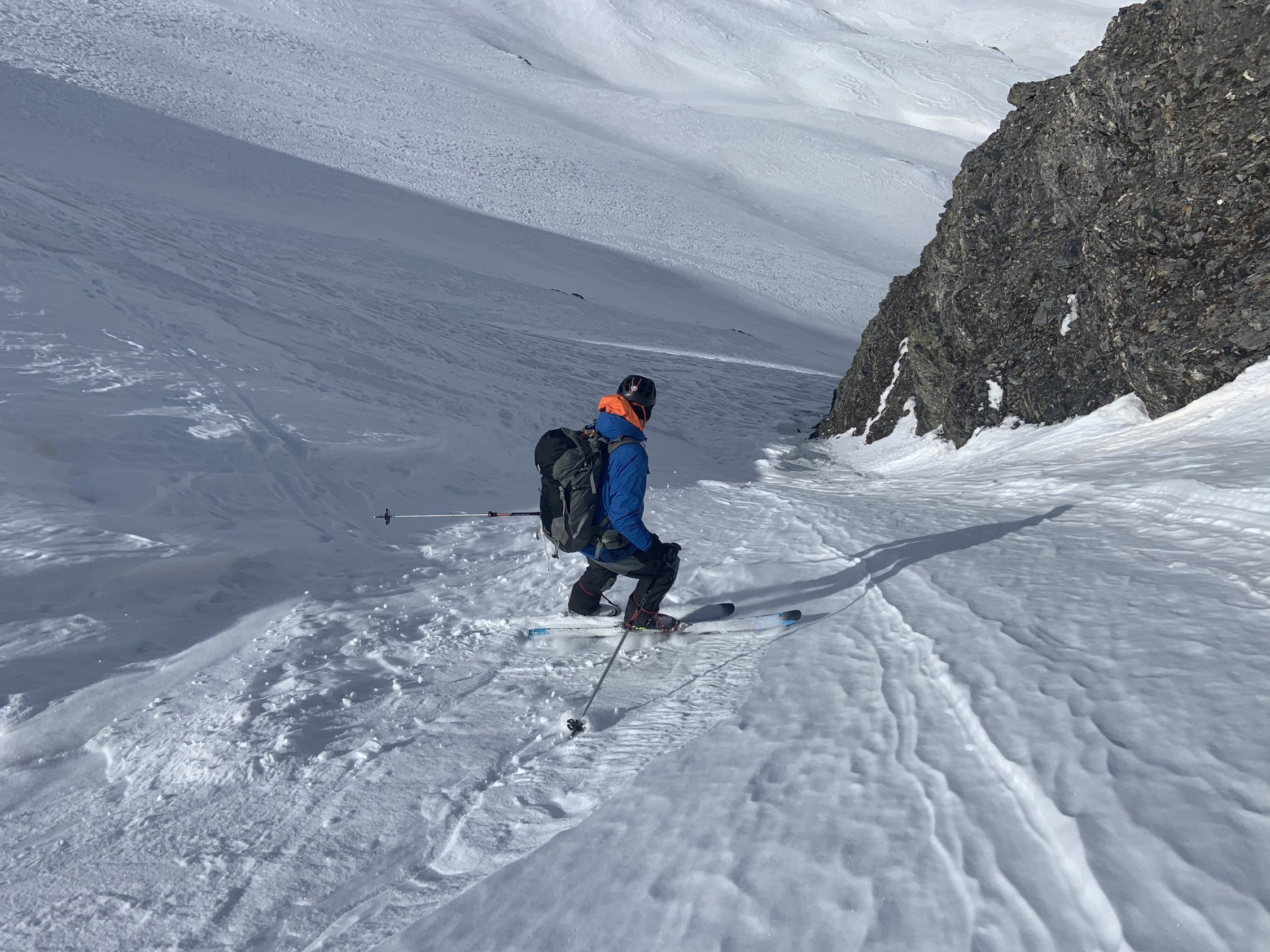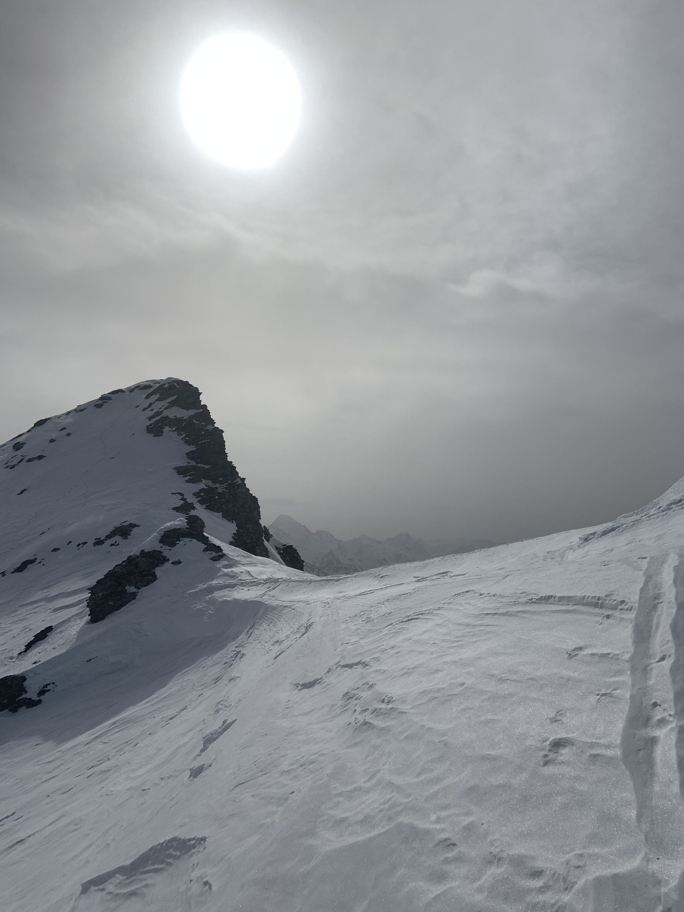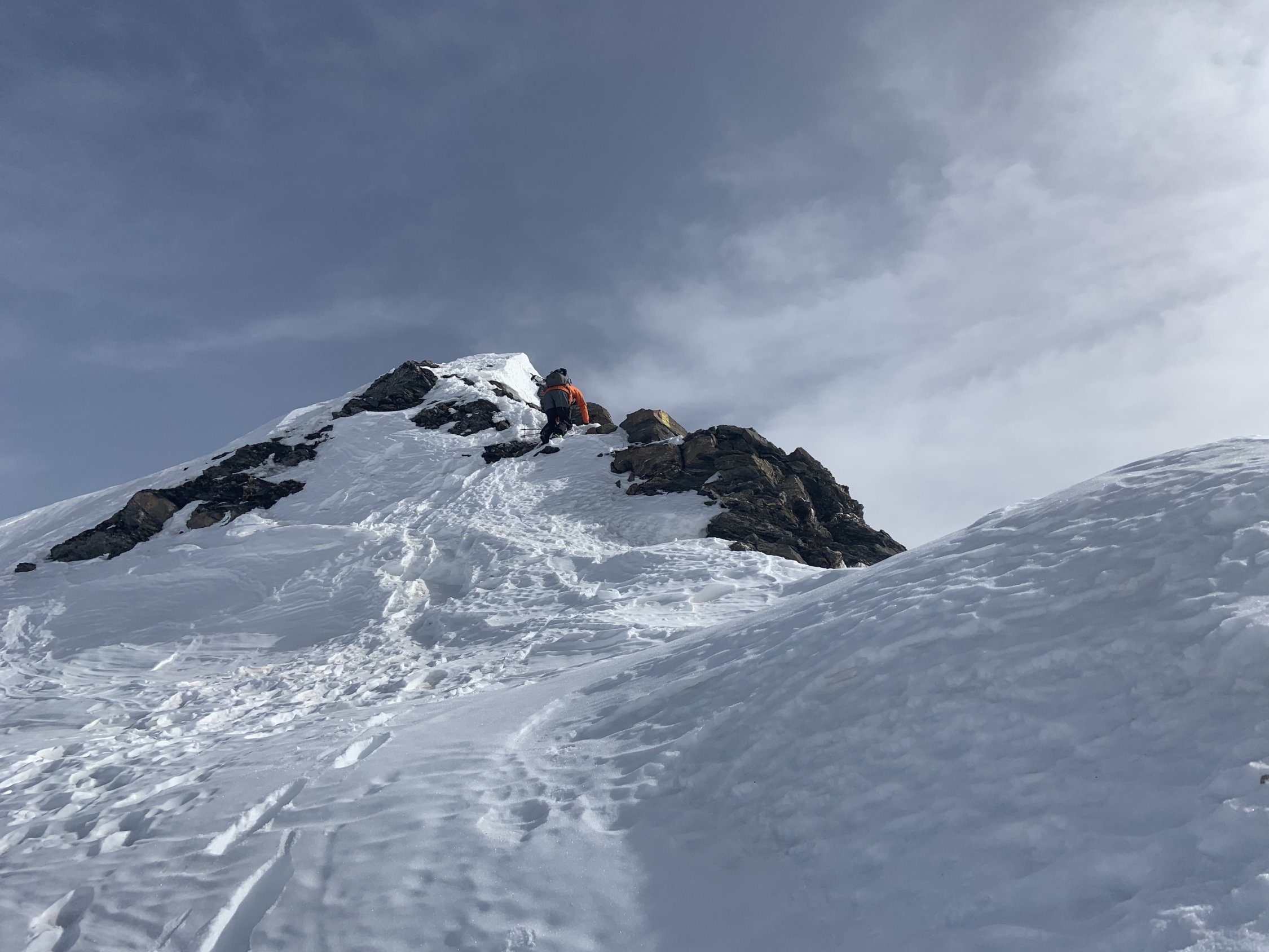 Sind beim Aufstieg zu lange Richtung Schollahorn gestiegen und mussten dann durch super Pulver (!) auf den richtigen Weg spuren. Danach oft mit Harscheisen, Tragpassage aber ohne Steigeisen bis zum Gipfel.