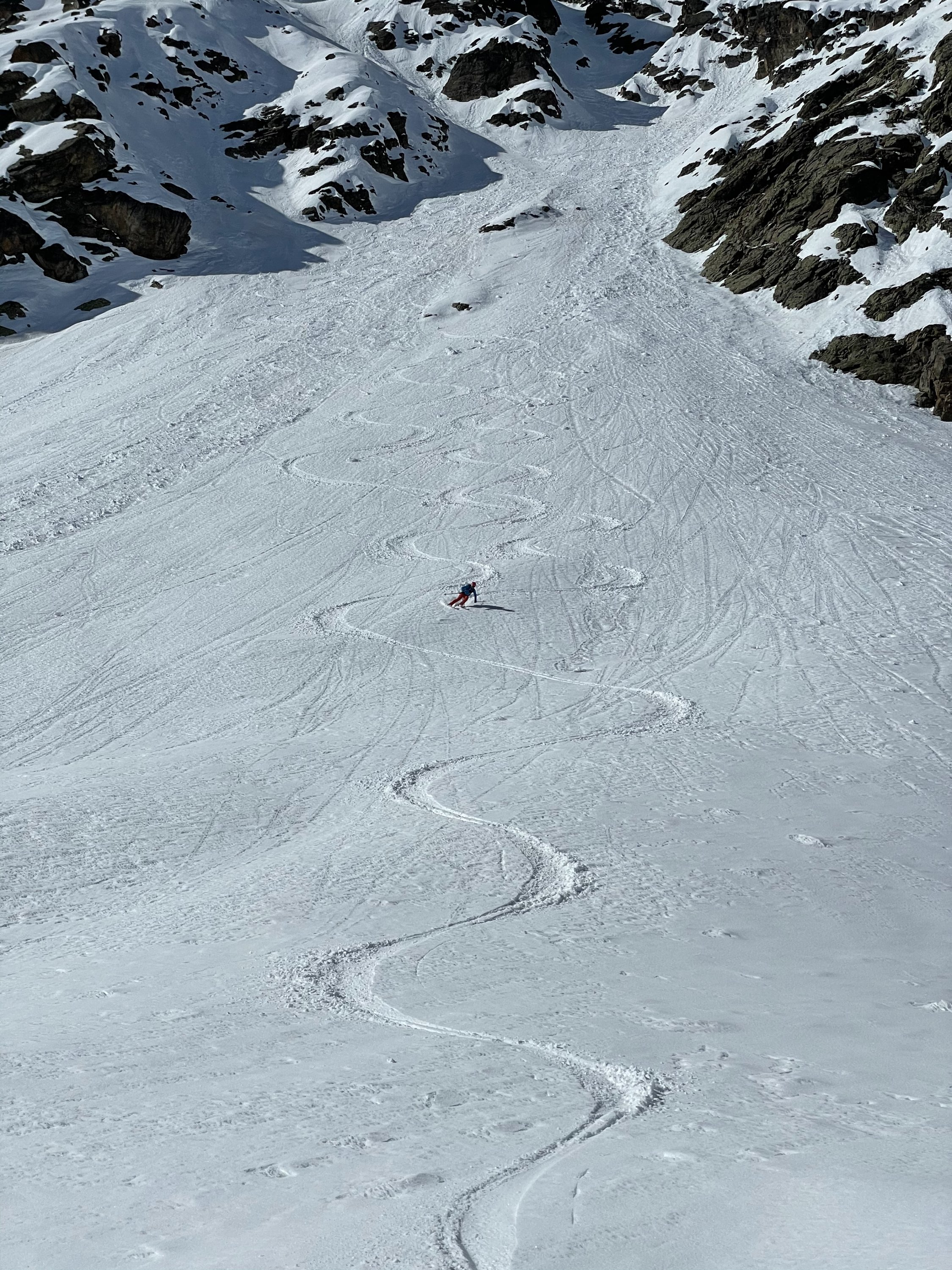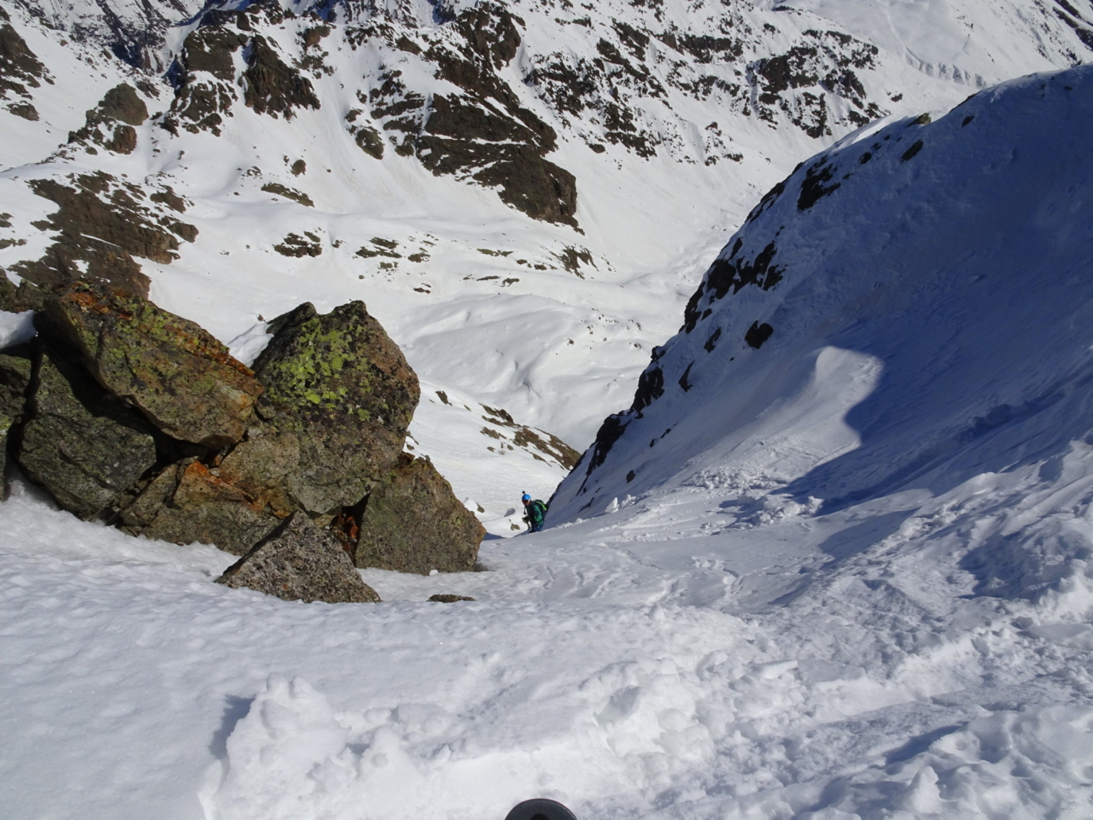 Abfahrt über die sehr steile Rinne (sehr sichere Verhältnisse Voraussetzung) ins Ereztäli