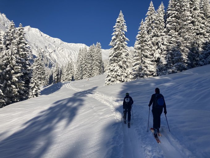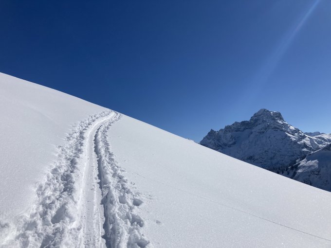 Was für ein traumhafter Märztag. Der Neuschnee von gestern und die Sonne heute waren einfach ein Traum. In Summe gab es im Tal bis 20cm und oben bis etwa 30cm locker und kaum wind beeinflusst gefallenen Neuschnee. Dieser liegt meist auf einer harschigen Unterlage. Frühmorgens Start bei kalten Temperaturen und herrlichstem trockenen Pulver. Aufstieg problemlos und dank des Neuschnees nun auch wieder die Steilstufe im Wald durchgehend problemlos aufzusteigen. Abfahrt dann oben mega Pulver. Mitte dann schon schwerer Pulver und unten die Steilstufe im Wald in der Abfahrtsschneise kurze Stelle abgeschnallt. Rest in der Steilstufe fahrbar, aber schwerer Batz, da steiler Südhang.