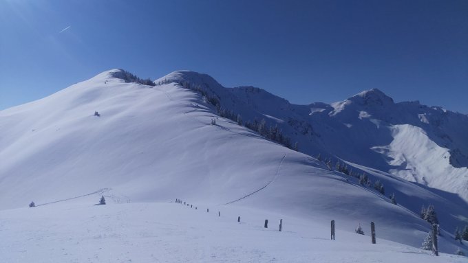 Durch den Wald angenehm mit der neuen Schneeauflage. Gute Spur bis 1840 von den Gipfelanwärter des Fadeuer vor uns. Ab da neu gespurt zum Punk 1975 müM weiter auf dem Grat bis zum Rothorn Punkt 2353müM ohne Harscheisen und einsam unterwegs.