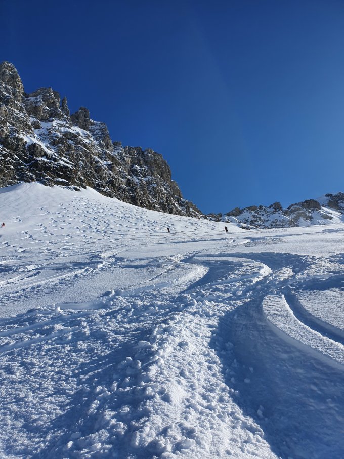 Schlüsselstellen am Gemsfairenstock haben gute Spur, geht ohne Harscheisen. Am Klettersteig zum Tüfelsjoch haben sich heute einige schwer getan. Die ersten ca 5-10m haben noch keine Metallbügel zum Stehen, sodass es einiges an Armkraft braucht. Der Klettersteig auf der anderen Seite ist viel weniger anstrengend, hat aber am Ende eine ca 30m lange "Lücke" (kein Fixseil), wo man entweder abseilt oder absteigt (steiler Firn). Ganz am Ende hat es nochmal Fixseile um eine kurze felsige Steilstufe zu überwinden. Abfahrt war ein Traum. Ca 20cm feinster Pulver auf harter Unterlage.