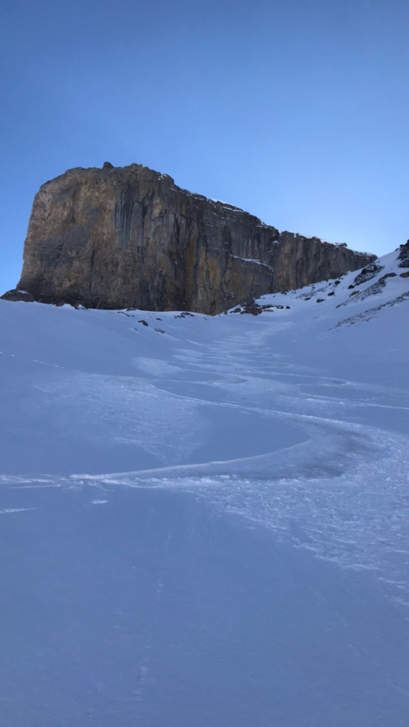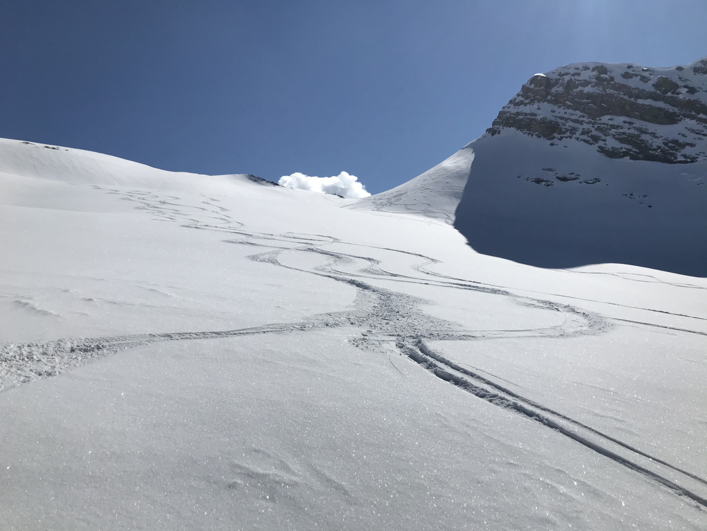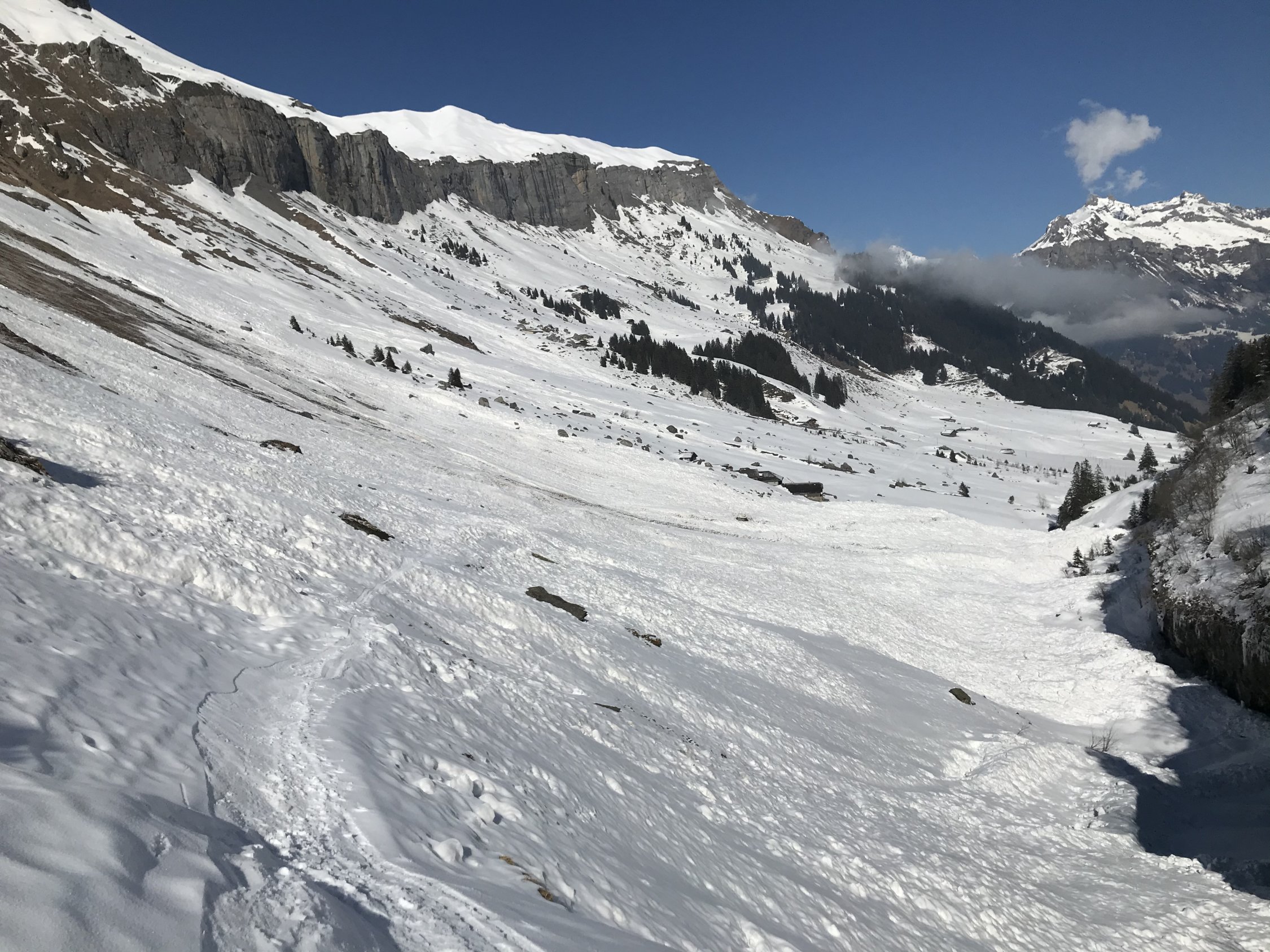 Bester Pulver im Tälli. Üschenetäli hat noch gut Schnee, Abfahrt nach Eggschwand wird wohl bald Tragepassagen haben..