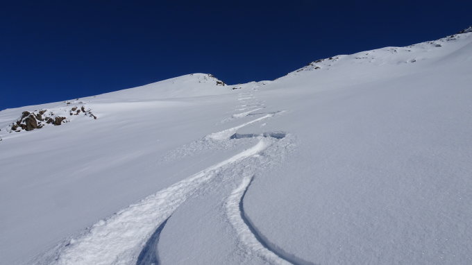Im Aufstieg alles 20cm Pulverschnee und in der Abfahrt je nach Hang Ausrichtung feuchter Pulver oder eben 20cm schönster super zu fahrender Pulverschnee.(endlich wieder Pulverschnee)