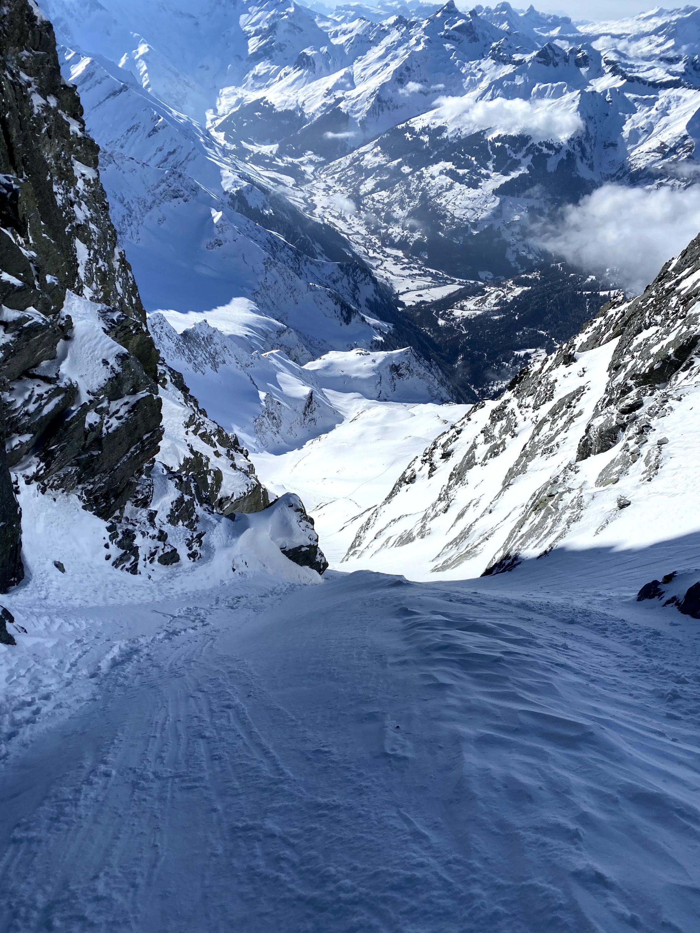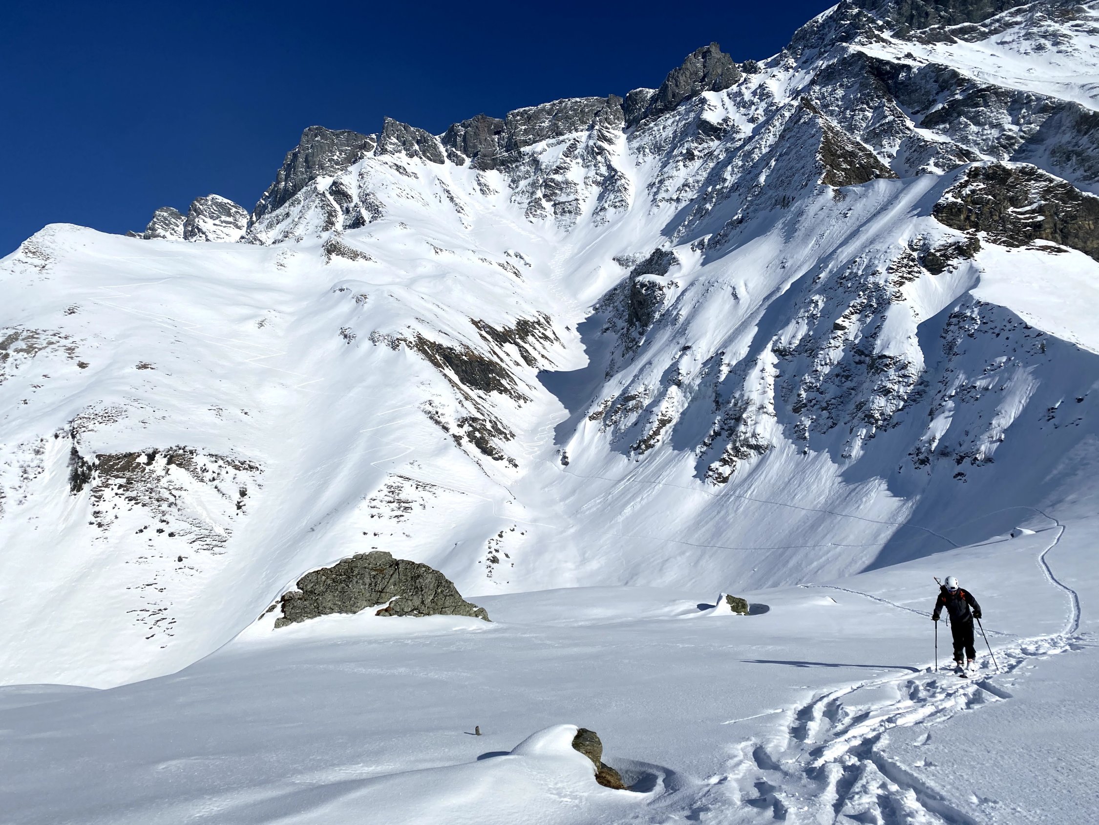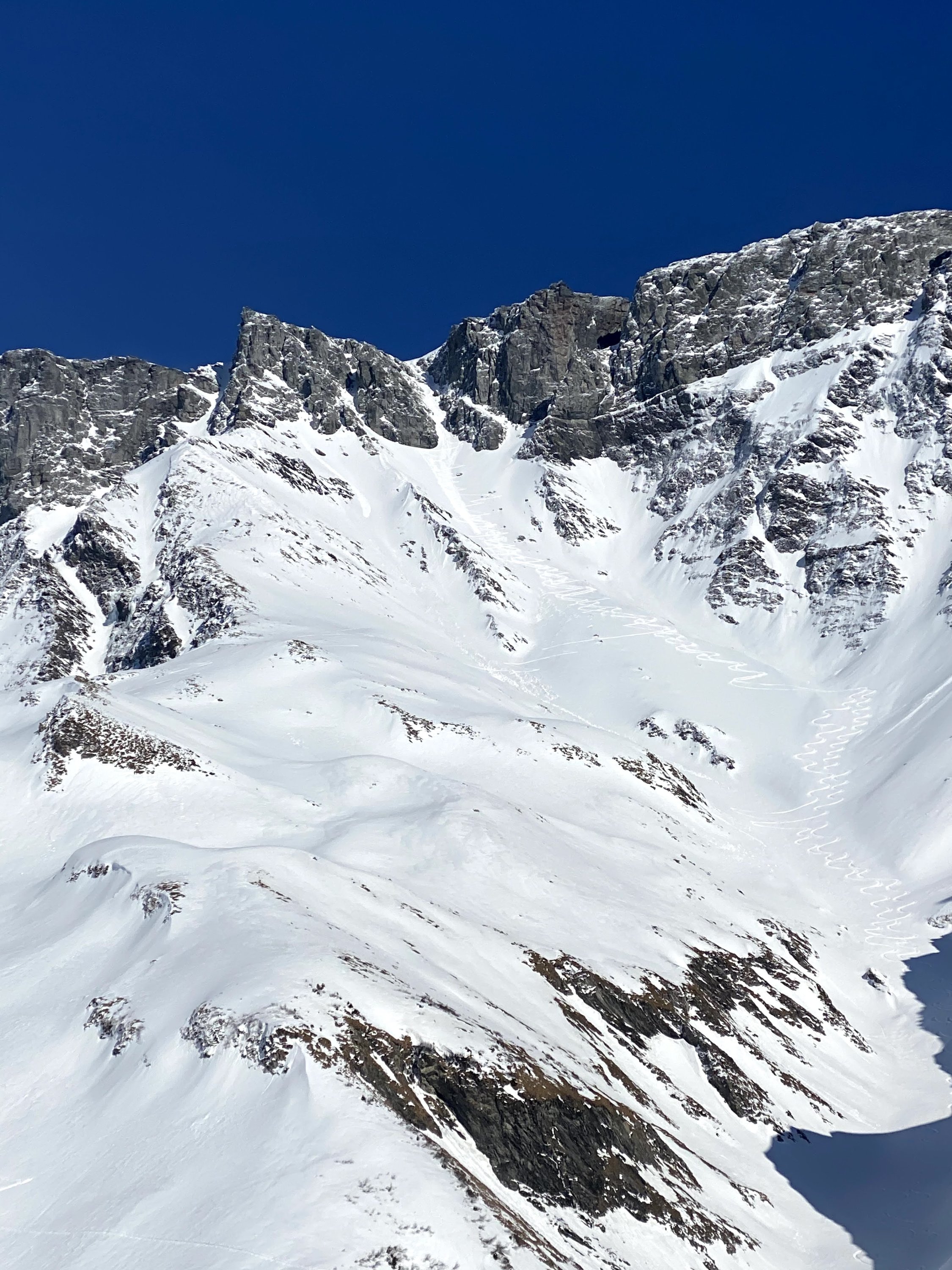 Inspiriert von Herrn Dettlings Blogpost: https://mdettling.blogspot.com/2018/04/piz-sardona-3056m-westcouloir.html starteten wir kurz nach 7 Uhr morgens vom Parkplatz der Tschinglen-Bahn. Es war für uns etwas langsamer (Ski montieren und demontieren) durch den Wald bis kurz nach Stelliwald, wo wir endlich die Skier definitiv montieren konnten. Auf den verschiedenen Unterlagen befanden sich ca. 5-10 cm Pulver von ca. 1400 bis 2700Hm. Im Horen-Couloir war die Unterlage etwas eisig, was es idealer machte, die Skier einfach auf den letzten 50 Metern zu tragen, aber durch Geissegg und die Couloir-Mündung waren die Bedingungen viel besser. Bei tieferem, aber stabilem Schnee (20-30 cm) im Westcouloir waren Steigeisen hilfreich, aber der Eispickel blieb auf dem Rudel - sehr windig auf dem Gipfelplateau, der Gipfel erreichte nach 7,5 Stunden Aufstieg. Es liegt entweder etwas weniger Schnee oder es fallen mehr Steine in die Oberseite des Couloirs als im Blogbeitrag von 2018 beschrieben - daher ist der Einstieg etwas schwierig, aber definitiv nichts, was ein Seil oder einen Gurt erfordert. Perfekte Kurven im Couloir und wirklich bis nach Horen (wir haben es vermieden, die Felle zu benutzen, um nach Horen zu klettern, indem wir hoch geblieben sind). Am Horen Couloir schmolz der Schnee ziemlich, aber immer noch skifahrbar. Wir konnten es nicht vermeiden, nach Stafeli Felle für den Aufstieg zu verwenden, aber danach konnten wir Lawinenreste zur Unter Falzüber-Hütte auf 1330 m absteigen. Problemloses Ski-Tragen danach zum Auto, das wir nach 2,5 Stunden Abstieg erreichten.