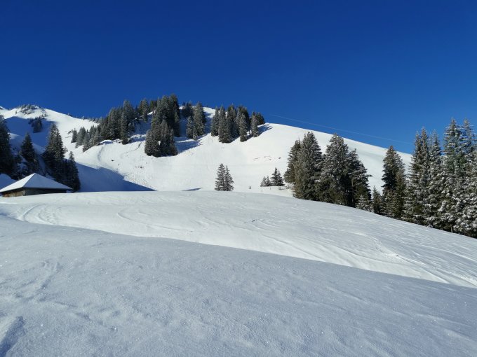 Start um 7:45 bei -5 Grad. Aufstieg und Abfahrt perfekt mit 5-10cm Pulver auf solider, teils etwas ruppiger Unterlage. Gipfelhang abgeblasen und hart/schneearm.