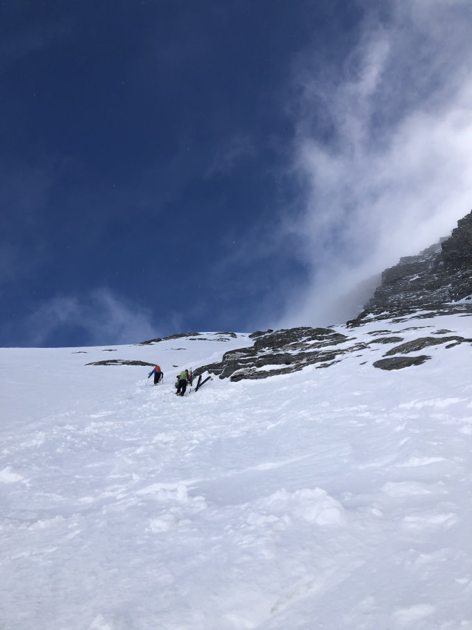 Mit Ski bis 3050m, Skidepot. Danach mit 2 Pickeln in bester Trittspur zum Grat und über diesen exponiert zum Gipfel.