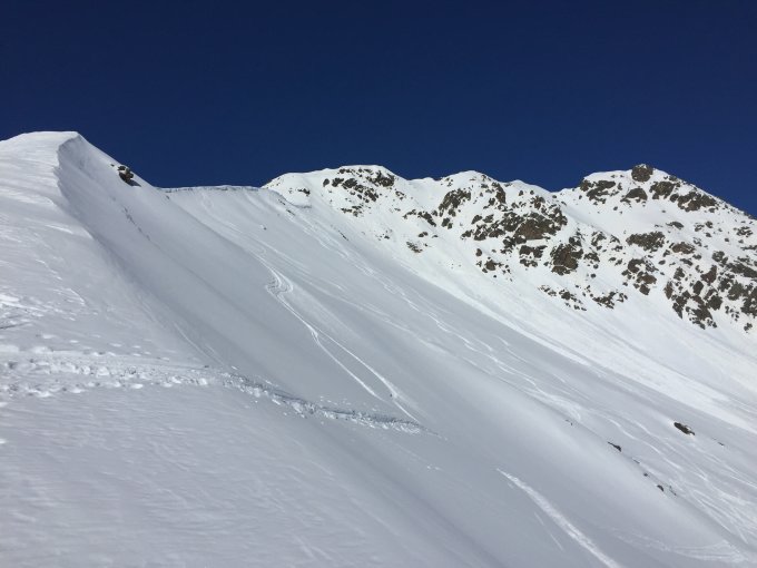 Grat ab Skidepot/Wintergipfel zum Hauptgipfel mit gutem Trittschnee, Steigeisen u. Pickel nicht erforderlich. Abfahrt Ostseitig noch Pulver, auf der Südseite gut aufgesulzter Firn.