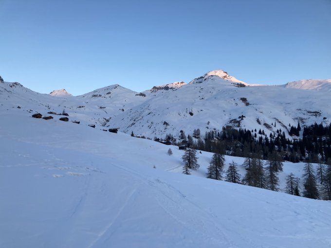 Gute Bedingungen im Aufstieg wie auch in der Abfahrt. Start um 06.30, alles gefroren, nur einen Hauch von Neuschnee. Leiter problemlos, Gipfelhang schon stark zerfahren. Abfahrt zur Alp Nursin und Wiederauftieg via Carnusapass zum Runal. Direkte Abfahrt über Südflanke via Faschas zurück nach Wergenstein. Abfahrt schon gut aufgesulzt. Um 12.00 wieder in Wergenstein.