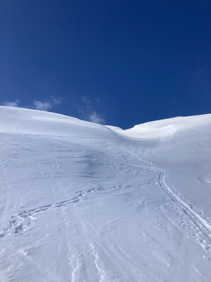 Die obersten Hänge hatten eine leichte Neuschneeauflage, es ist aber alles vom Wind bearbeitet.