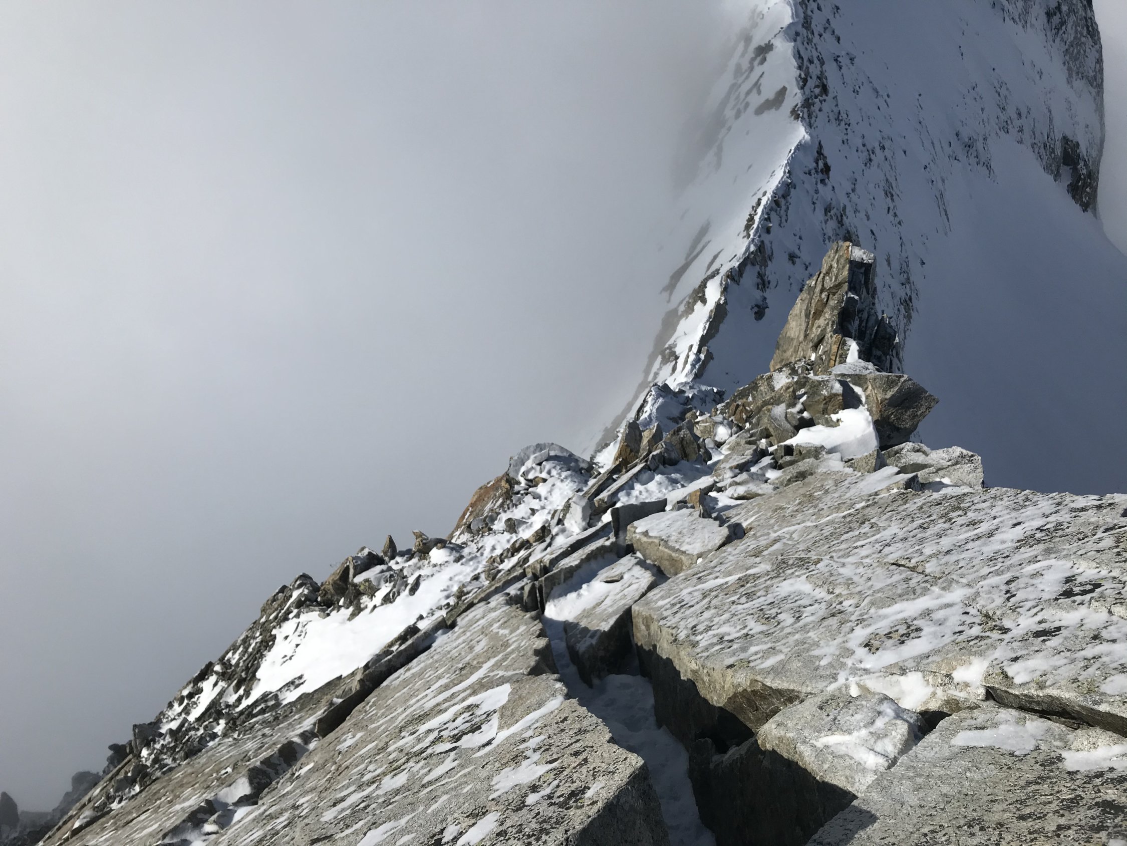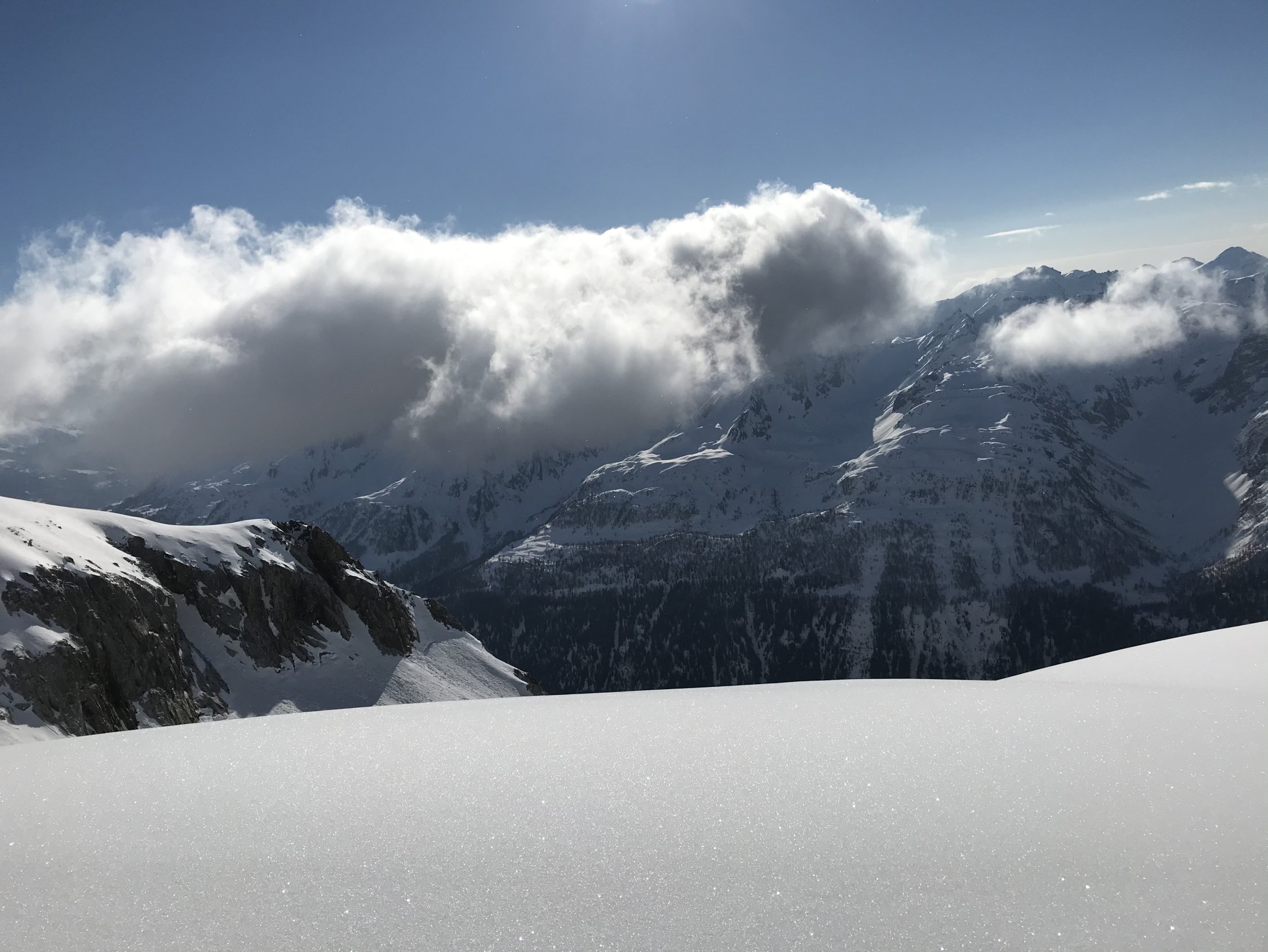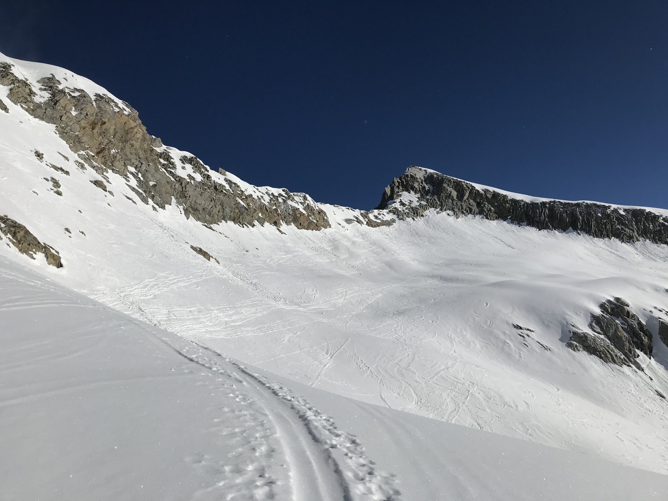 Wald im unteren Teil einiges umgestürzt, wenn man sich links hält recht mühsames Drüberklettern. Am Besten gerade aus hoch (zu Fuss). Durch den Wald sehr glasig und Bobbahnmässig, danach besser, oben etwas Pow. Gipfelaufstieg angezuckert. Steigeisen kein Luxus.