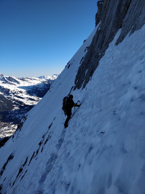 Wasserfallkamin eher schwierig da kein Eis vorhanden, die letzte Seillänge (Rampeneisfeld) vorm brüchigen Riss hat dann wieder gut Eis drin. Götterquergang eher trocken, Vorsicht mit dem letzten Fixseil, dieses ist an der letzten Absicherung abgerissen und hängt nur noch lose an der Zwischensicherung, In der Spinne altes & sehr hartes Blankeis und im oberen Teil etwas Trittschnee, die nächsten Seillängen inkl. Quarzriss sind alle trocken und gut kletterbar, das Gipfeleisfeld ist blank und erfordert nochmal volle Konzentration bis zum Mittellegigrat/ Firngrat welcher dann im super Trittschnee bis auf den Gipfel führt. Abstieg via Westflanke problemlos