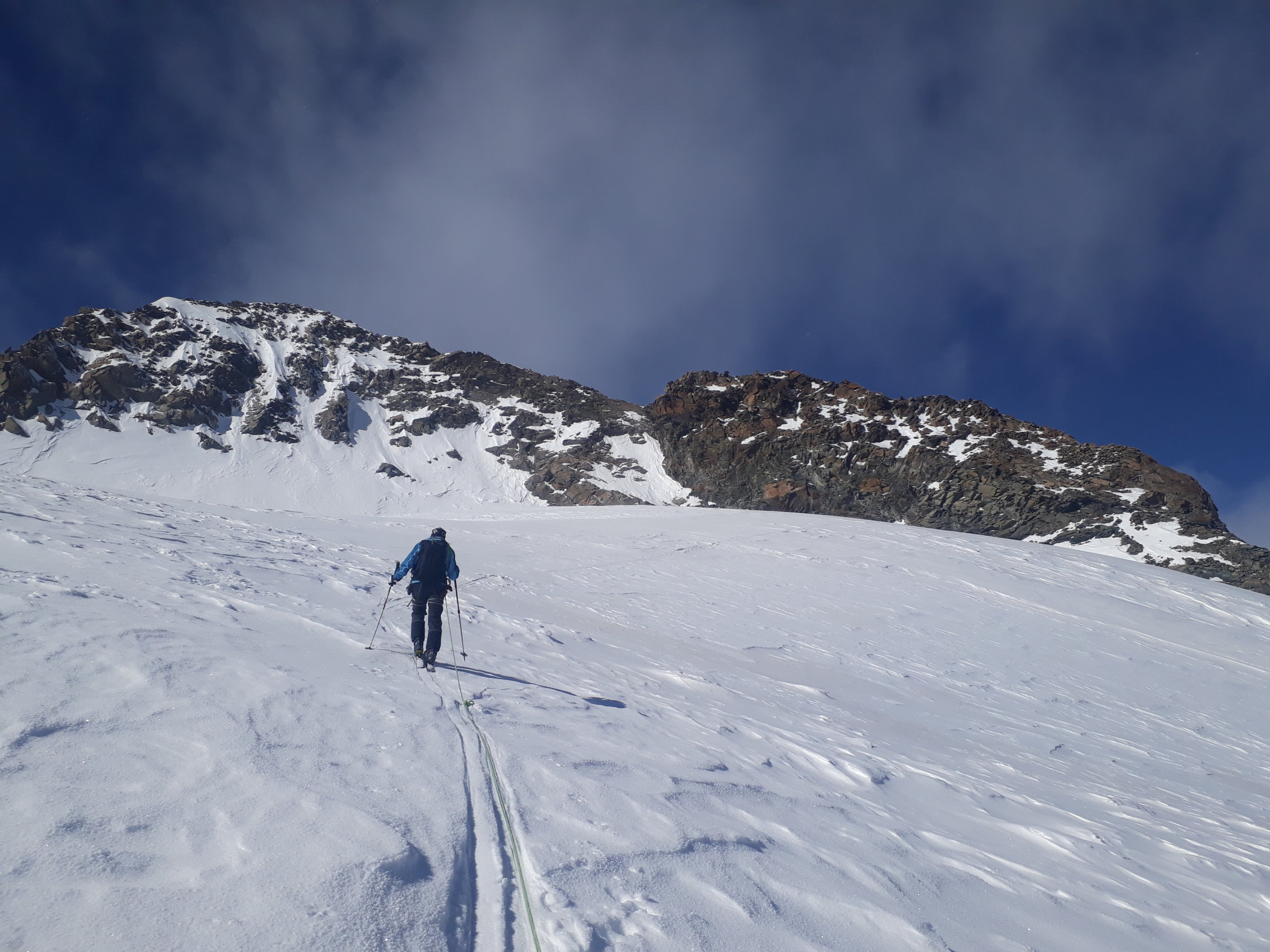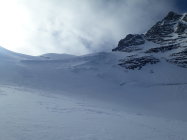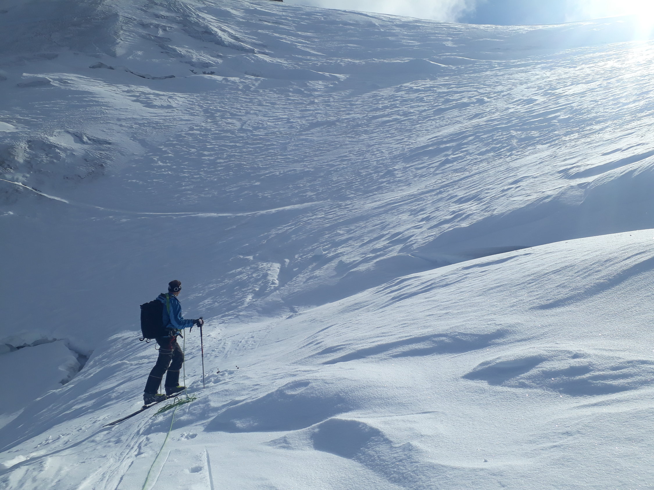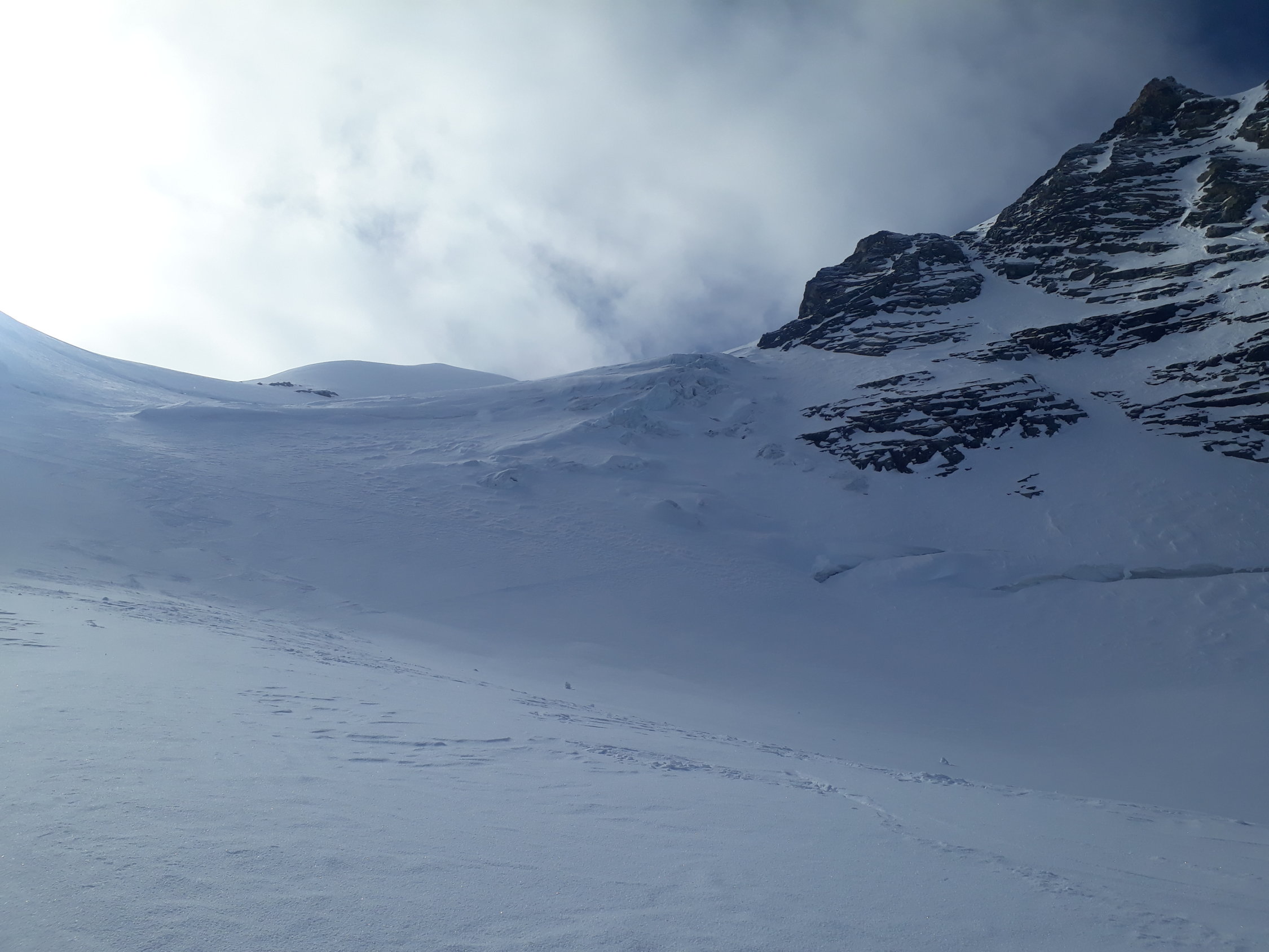 Der Gletscher ist sehr gut eingeschneit. Sowohl die untere Bruchzone wie auch der grosse Querspalte können derzeit sehr gut passiert werden. Der Grat ist zum grössten Teil schneefrei, dort wo es noch Schnee hat, ist es sehr guter Trittschnee.