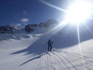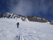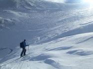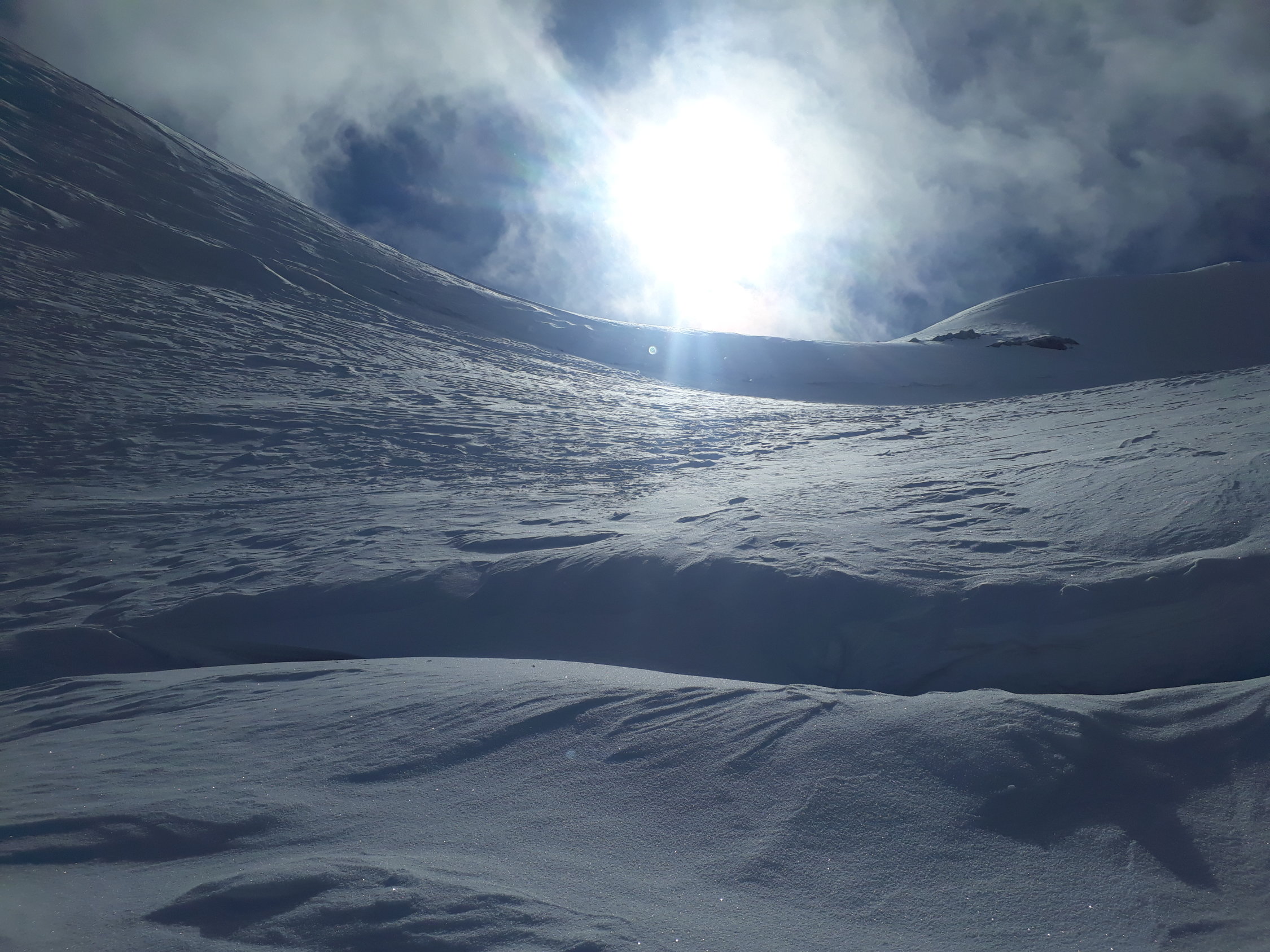 Es hat Pulverschnee, der stellenweise windbearbeitet ist, sonst auch Hartschnee. Der Aufstieg geht sehr gut mit Harscheisen, auch die Abfahrt ist sehr gut möglich.