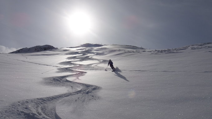 Abfahrt direkt vom Gipfel in den NW hang in den Ofen hinunter bei besten Bedingungen