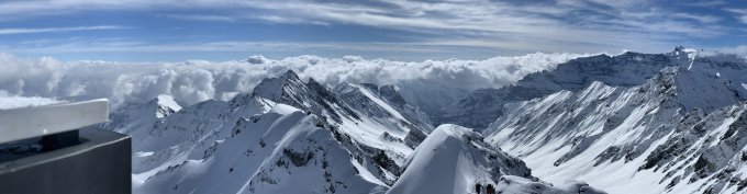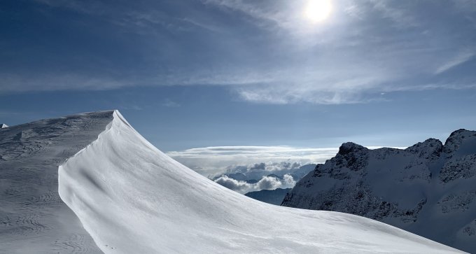 Heute war wirklich alles ausgezeichnet, prächtig wäre auch ein schönes Wort – eine feine Pulver Neuschnee Auflage von unten bis oben, ein großes blaues Loch am Himmel bei sonst recht umwölktem Panorama, angenehme Temperaturen, kaum Wind und der Aufstieg zum Gipfel direkt über die Blöcke - perfekt.