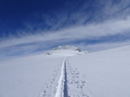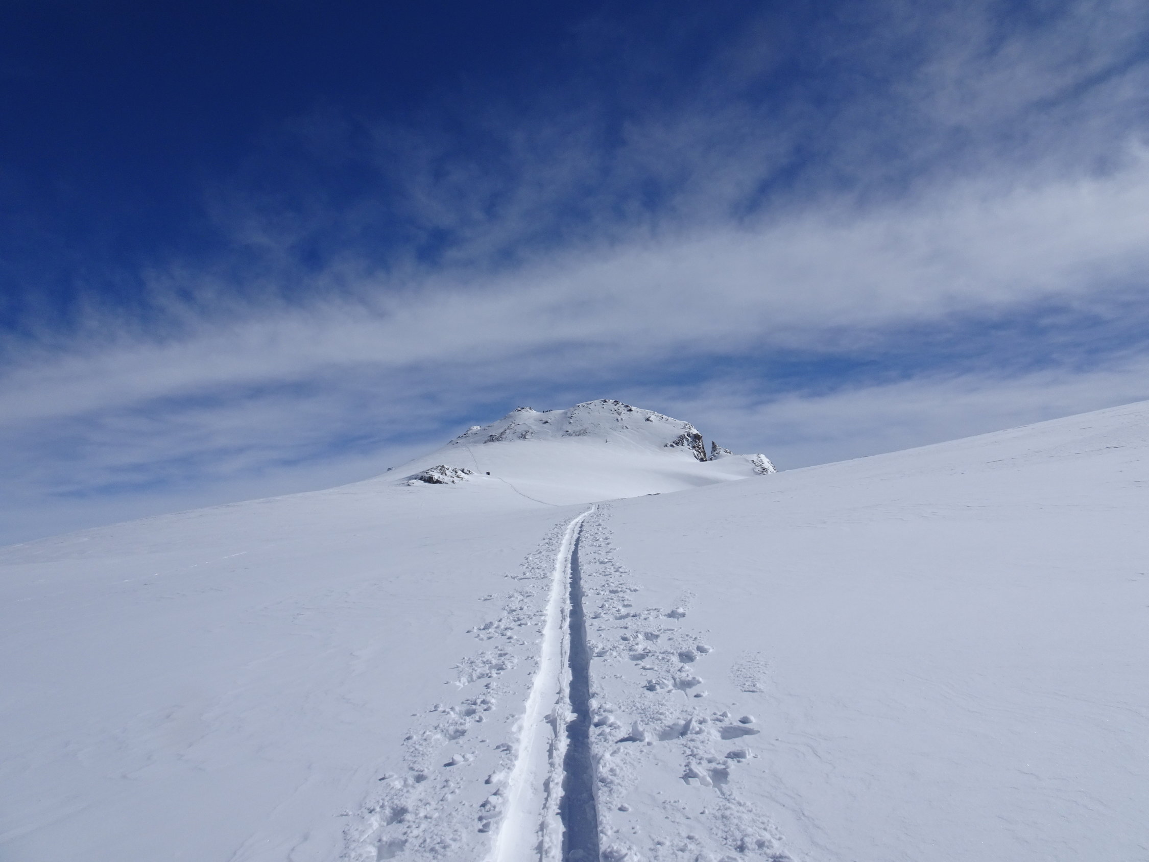 Heute war wieder einmal einer von diesen herrlichen Tourentagen. Über Nacht gab es leichten Neuschnee. Im Aufstieg spürbar noch nicht verbunden, aber mit der entsprechenden Vorsicht kein Problem, in der Abfahrt perfekt. Einzig im Gipfelbereich war es etwas windgepresst.