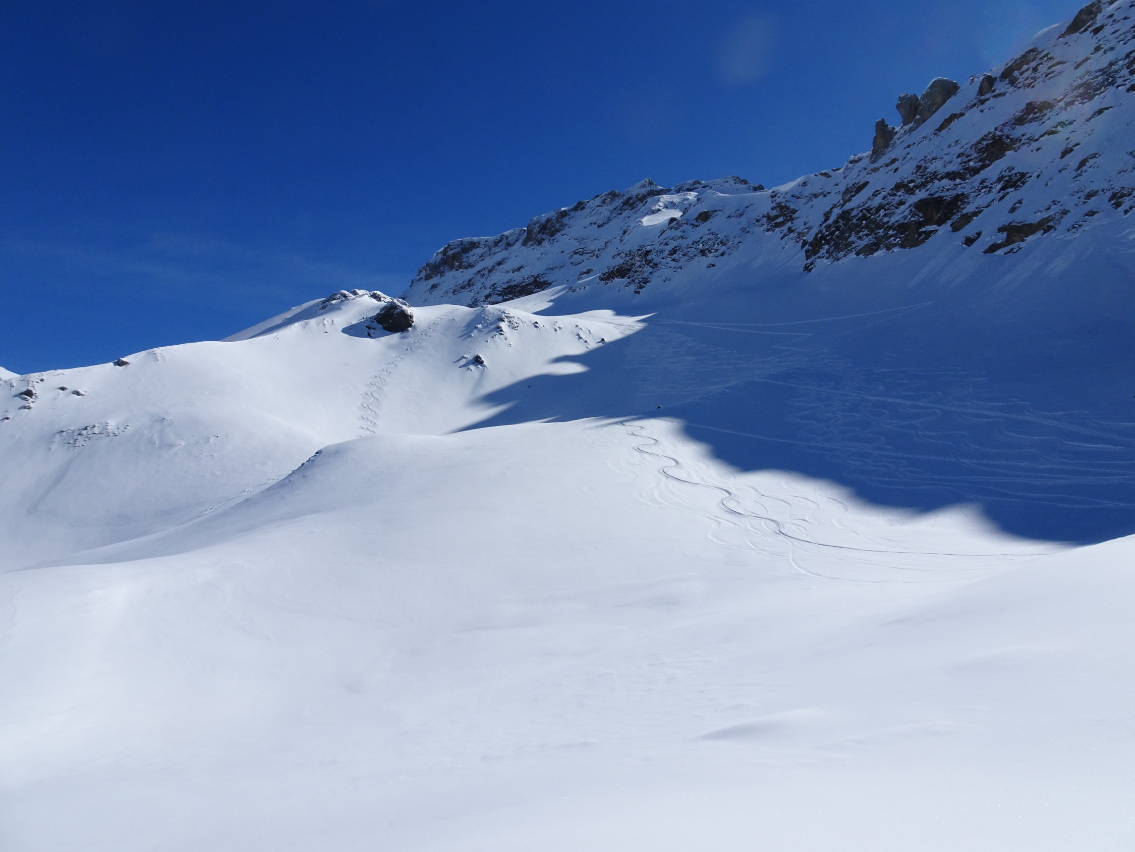 Die Traverse zum Frühstücksplatz war Dank einem "Schaufler" gut zu Fuss passierbar(vielen, vielen Dank!). In der Abfahrt konnte gut abgerutscht werden.