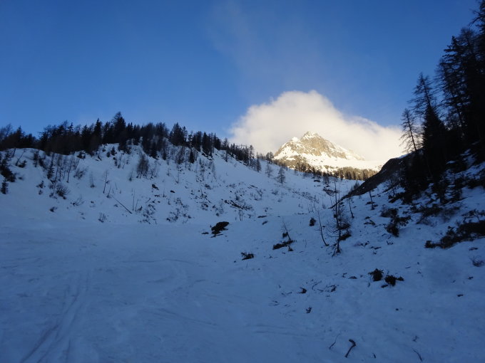 Im Aufstieg war die ganze Route hart. Aufstieg zuerst dem Riale di All'Acaua entlang, danach dem Hüttenweg zur Capanna Piansecco. Ab der Hütte war der Aufstieg etwas ruppig. Im oberen Bereich wechselten sehr harte Stellen mit kleineren Triebschneeablagerungen. Die letzten gut 100 Höhenmeter gingen wir zu Fuss. Steigeisen und Pickel sind zur Zeit hilfreich. Der Wind kühlte den Schnee ziemlich, so dass er nur im unteren Bereich aufsulzte.