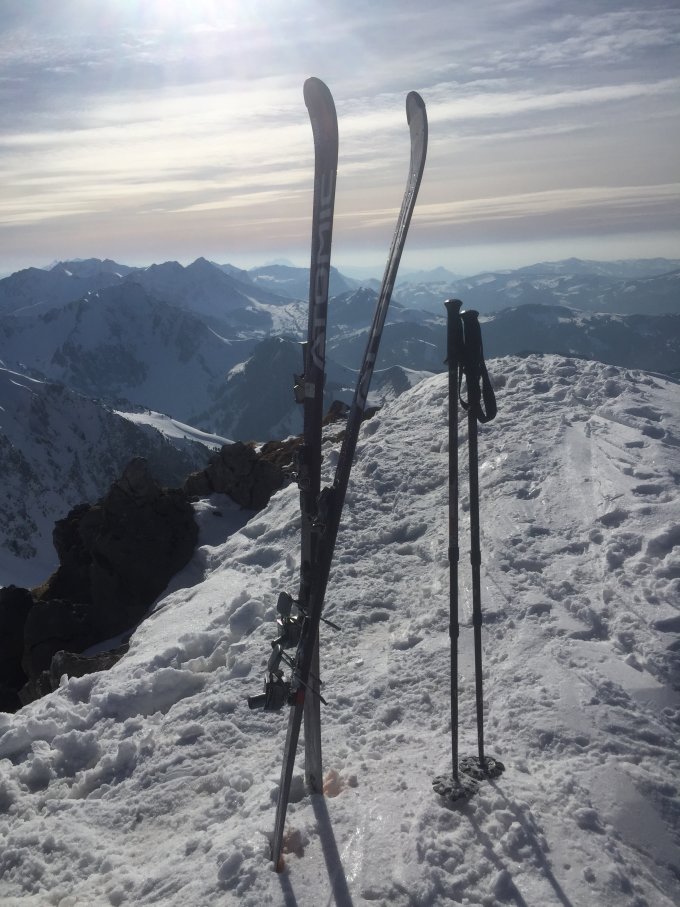 Nachmittagstour. Start um 14:40h im Schwefelbergbad, bis Sattel bei angenehm kühler Temperatur. Ab hier Ski aufgebunden zum Gipfel. Start ca. 16:15h. Top zum fahren, 10cm Pulver auf harter Unterlage