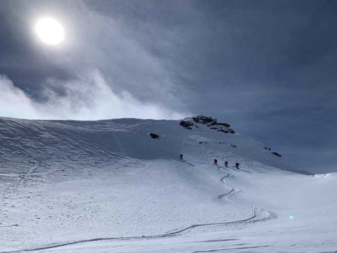 Ab ca.2200m überraschend gute Verhältnisse mit frischem Pulverschnee. Z.Teil ruppige Unterlagen. Starker Wind nur am Gipfel. Weiterhin durchgehende Schneedecke bis zum Parkplatz.