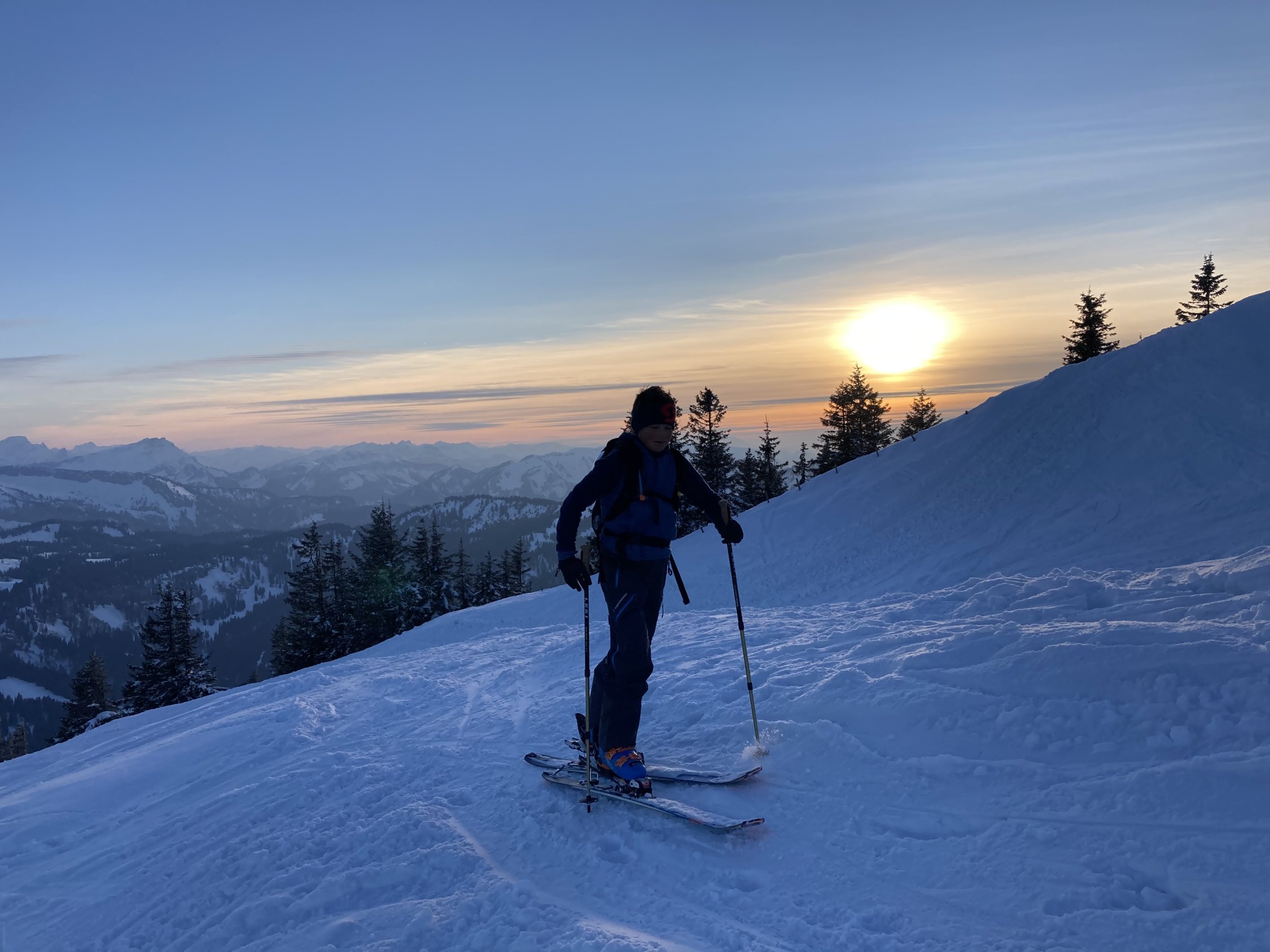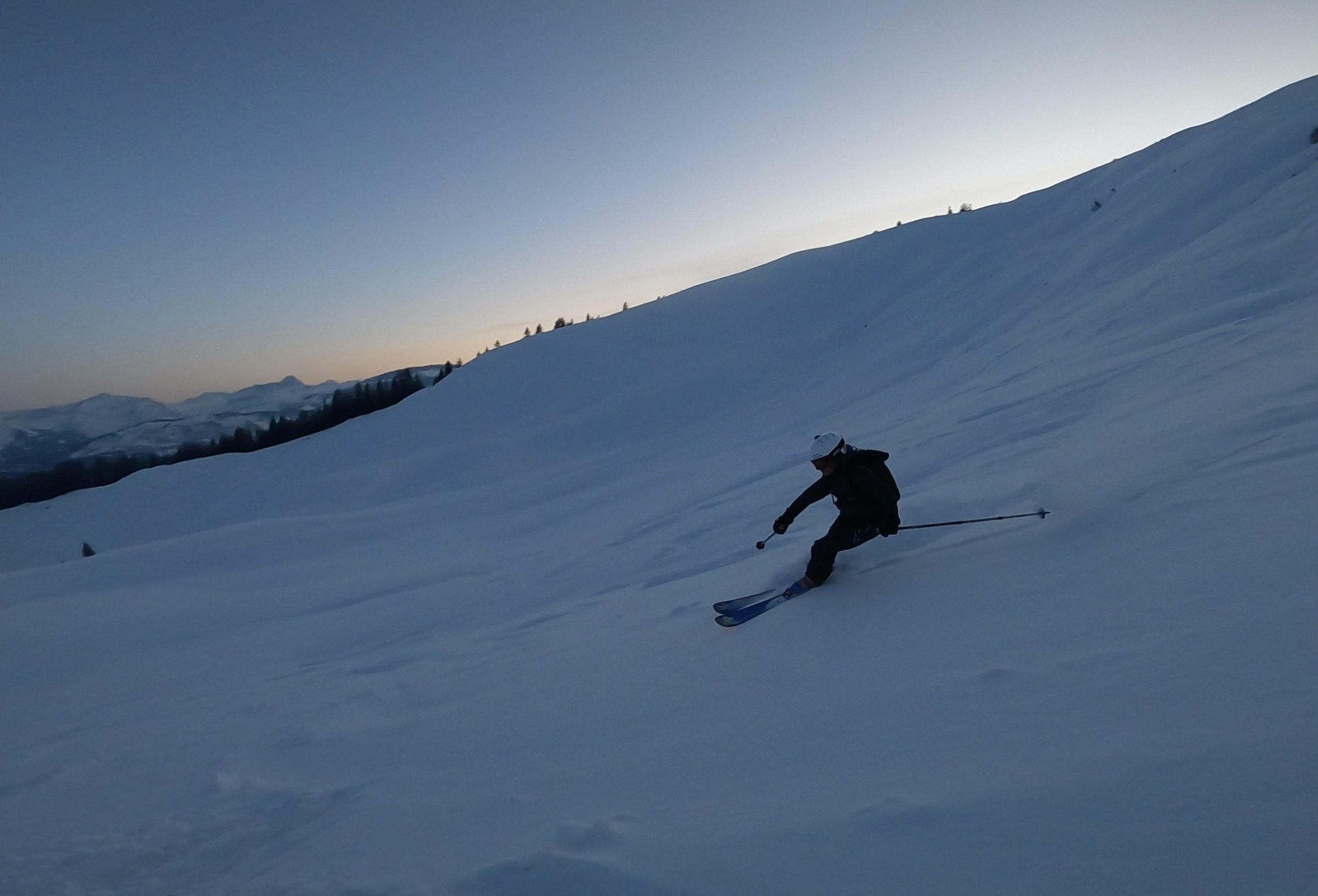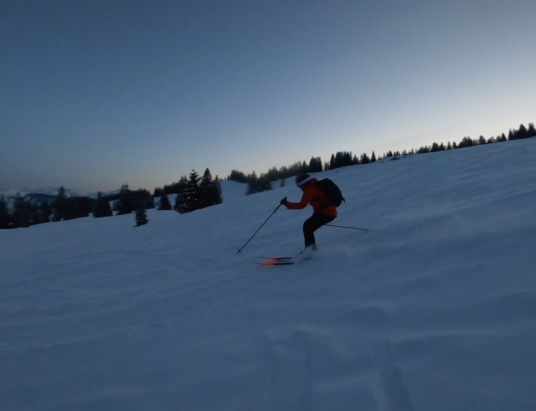 Kleine Feierabendrunde mit schönem Sonnenuntergang. Von gestern auf heute etwa 5-6 cm Neuschnee. Darunter harte Kruste. Trotzdem ganz gut zu fahren.
