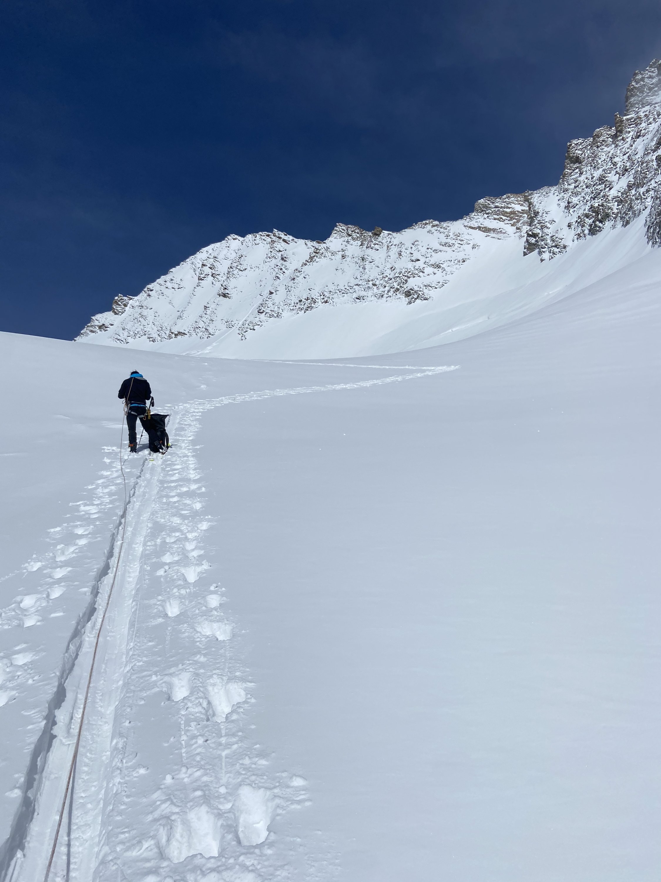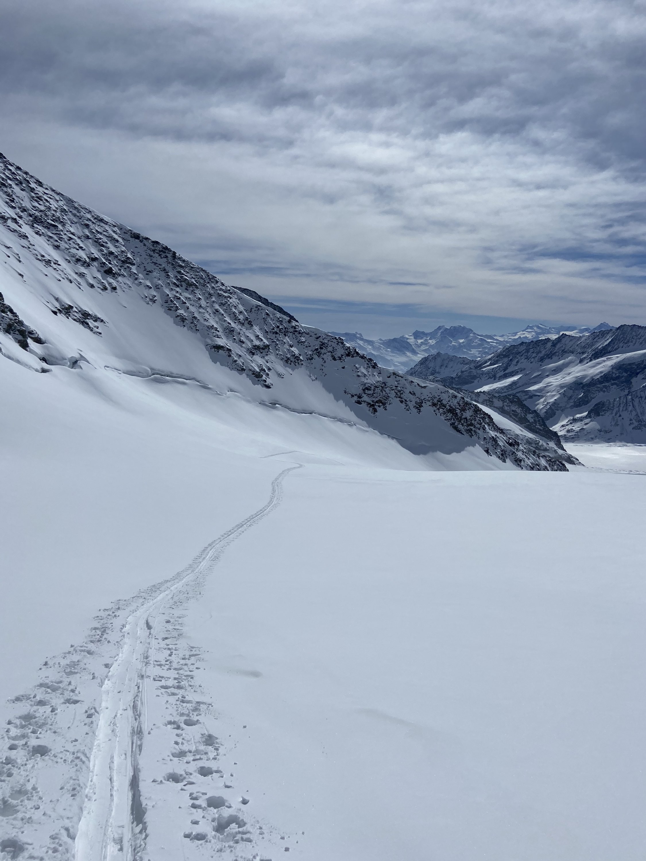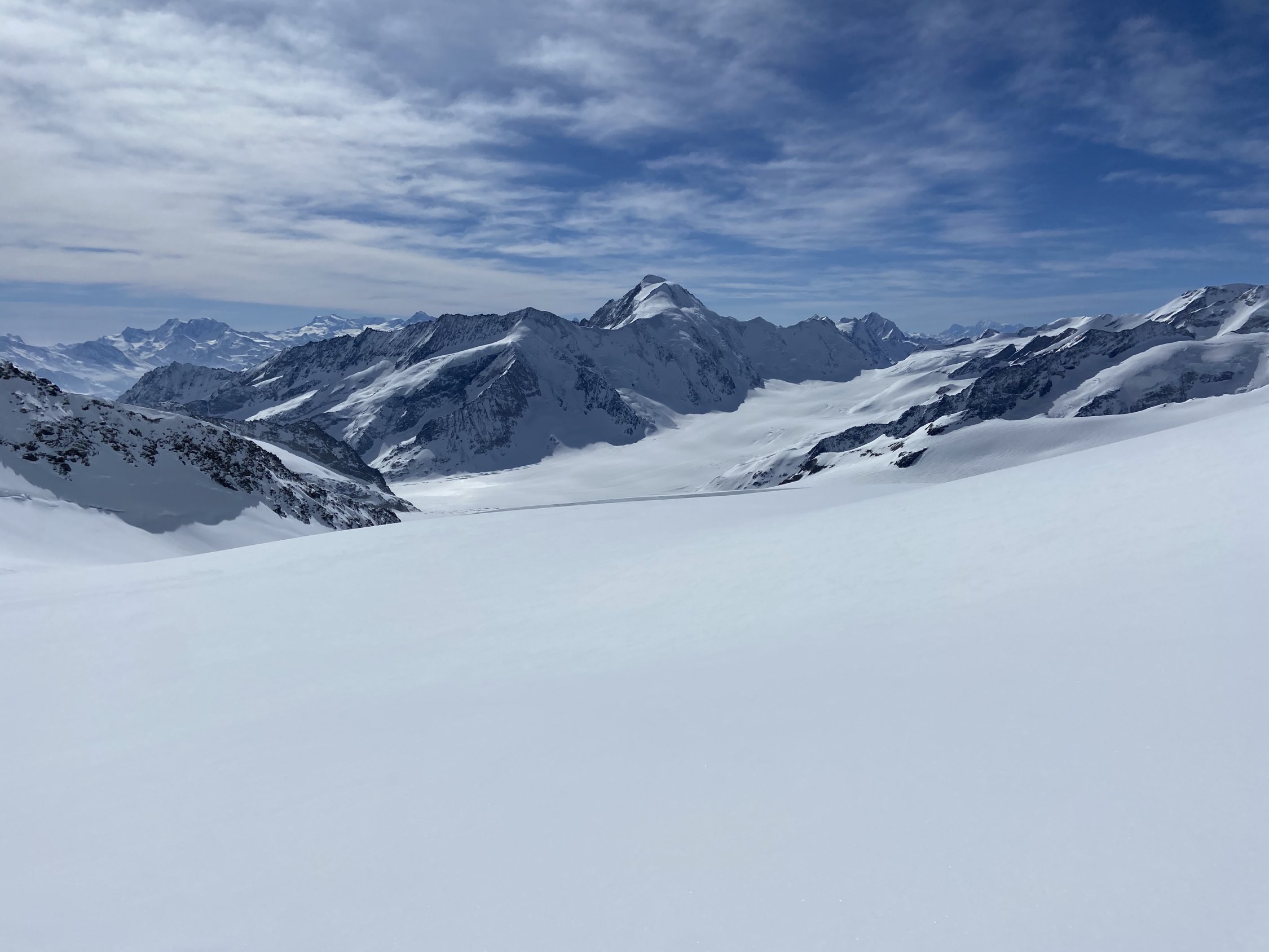 Viel Pulver auf dem Gletscher, Grat ebenfalls gezuckert. In der sw Flanke des grossen fiescherhorns guter tritt Schnee. Anschließend noch zum hinter fiescherhorn. Dort teil triebschnee, teils abgeblasen. Abfahrt dann nach Fiesch. 30-50 cm Pulver auf dem oberen Bruch. Abfahrt am Seil. Unten raus dann Stock Parade bis FinsteraarHorn Hütte, mit de Ski knapp bis fieschertal.