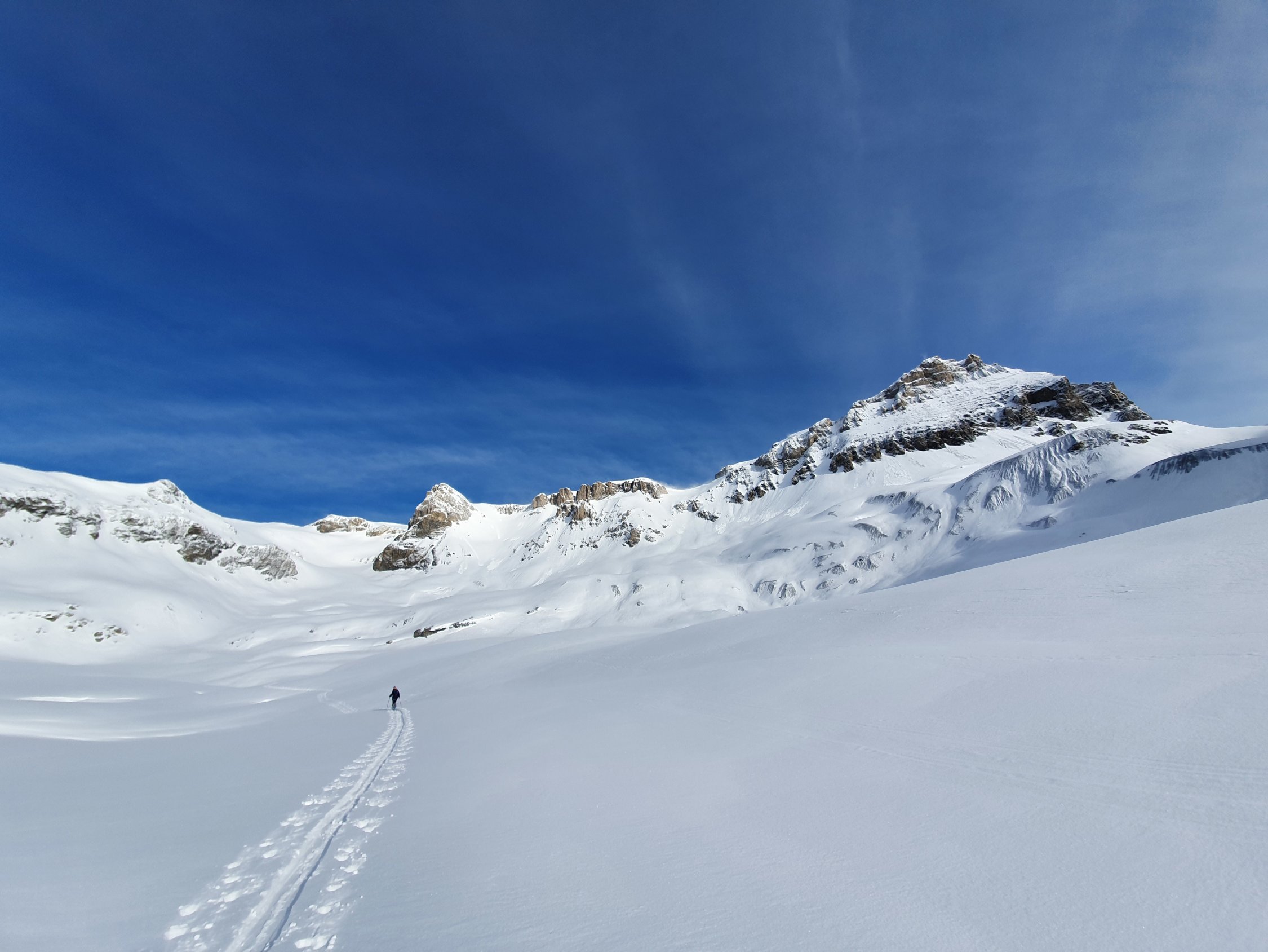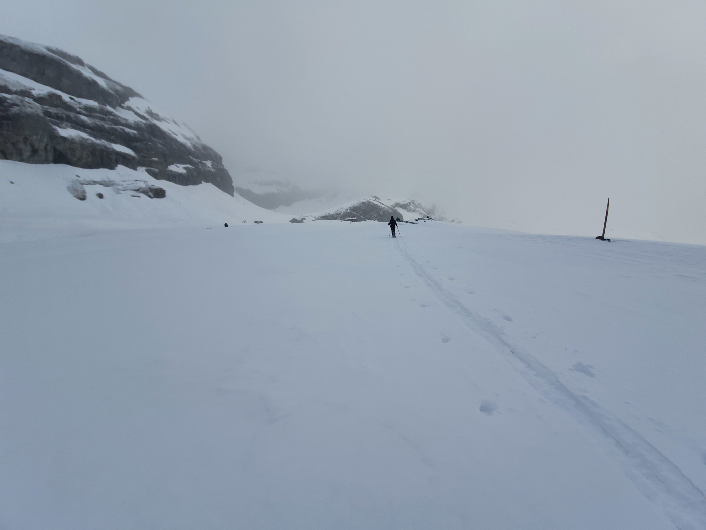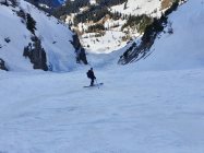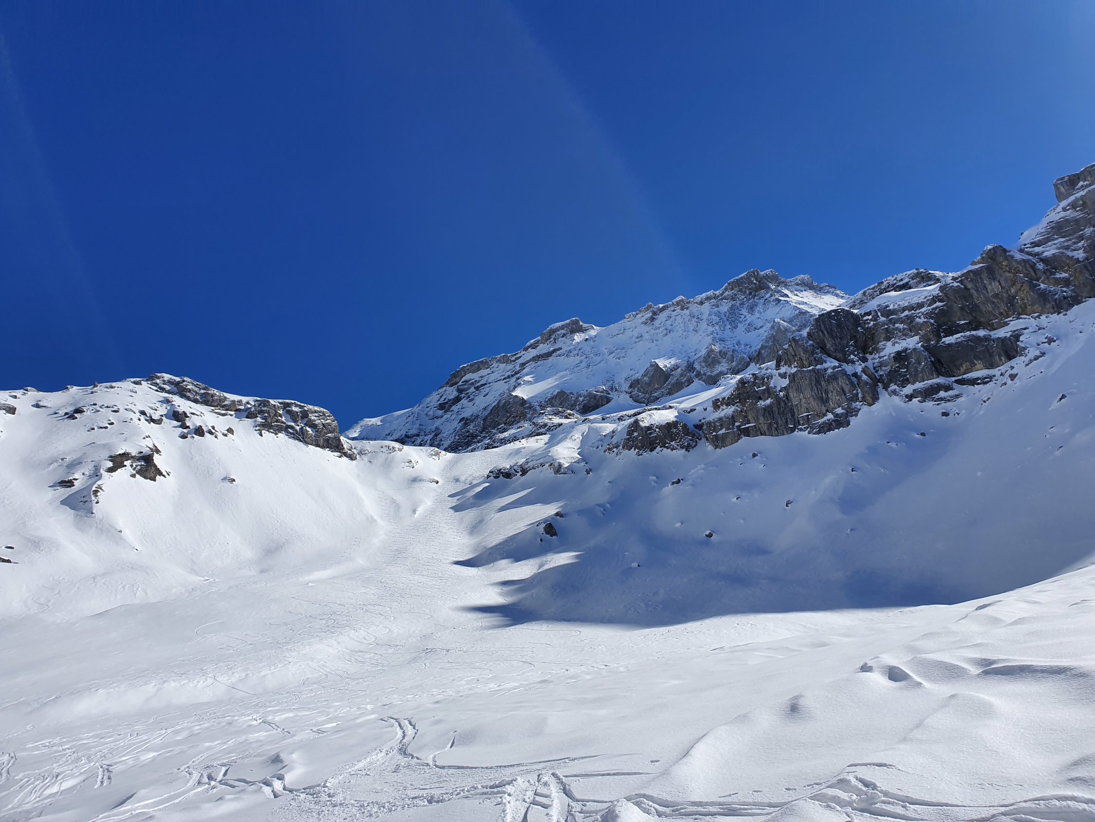 Die Abfahrt durch das Ammertetäli ist uns seit Jahren nicht mehr gelungen, entweder fehlte der Schnee oder hingen oberhalb der Ammertenhütte Schneemassen mit lästigen Fischmäulern. Heute war der Teppich mit frischen Pulver ausgelegt, der LWB meldete gering ohne Tagesgang.