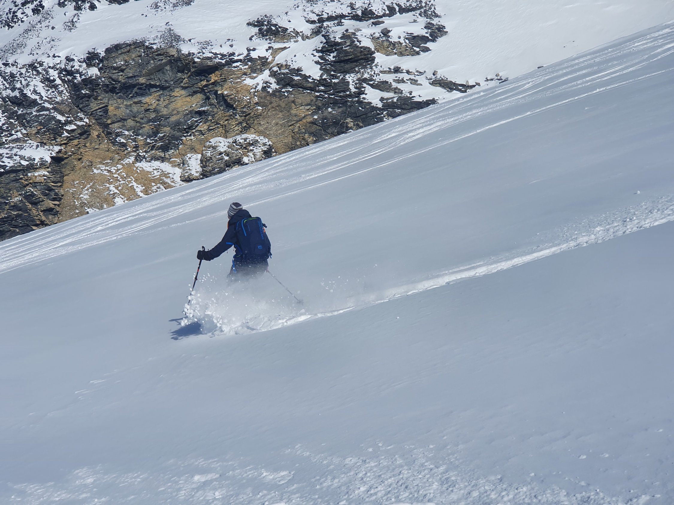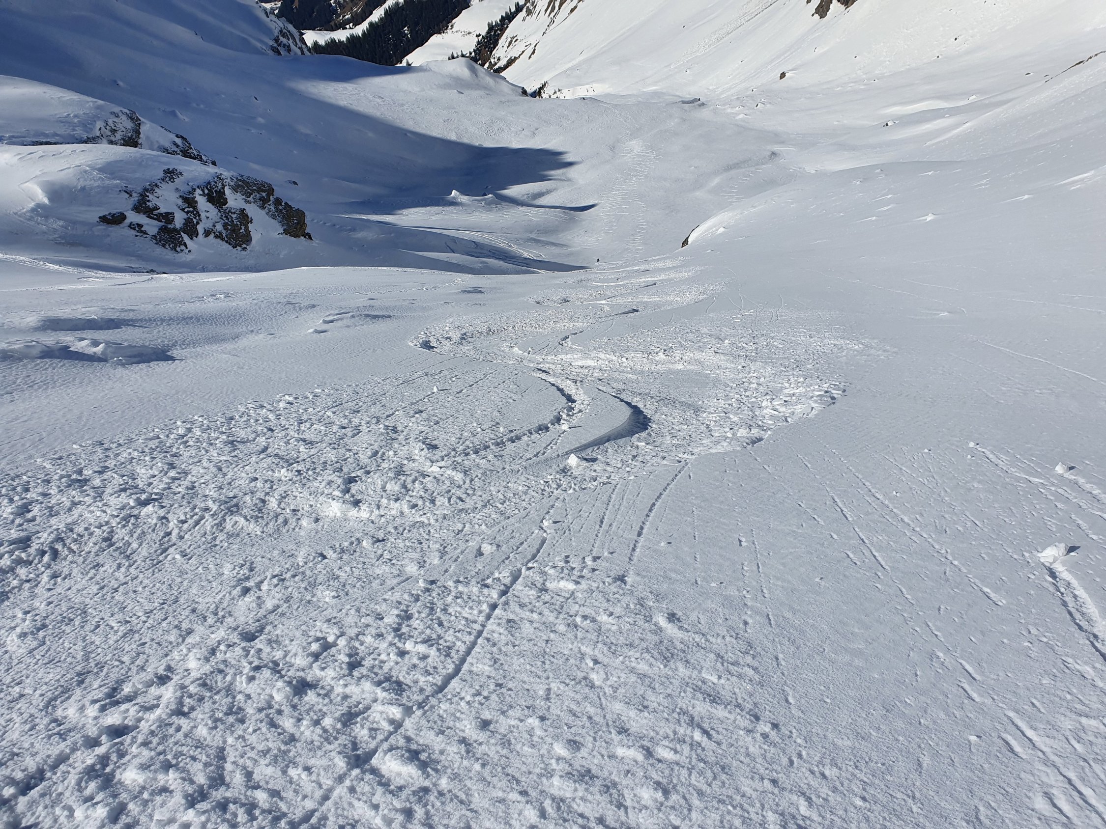 Im Couloir dann 10cm Pulver auf eisiger Unterlage etwas anspruchsvoller zu fahren, aber immer noch gut.