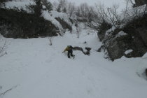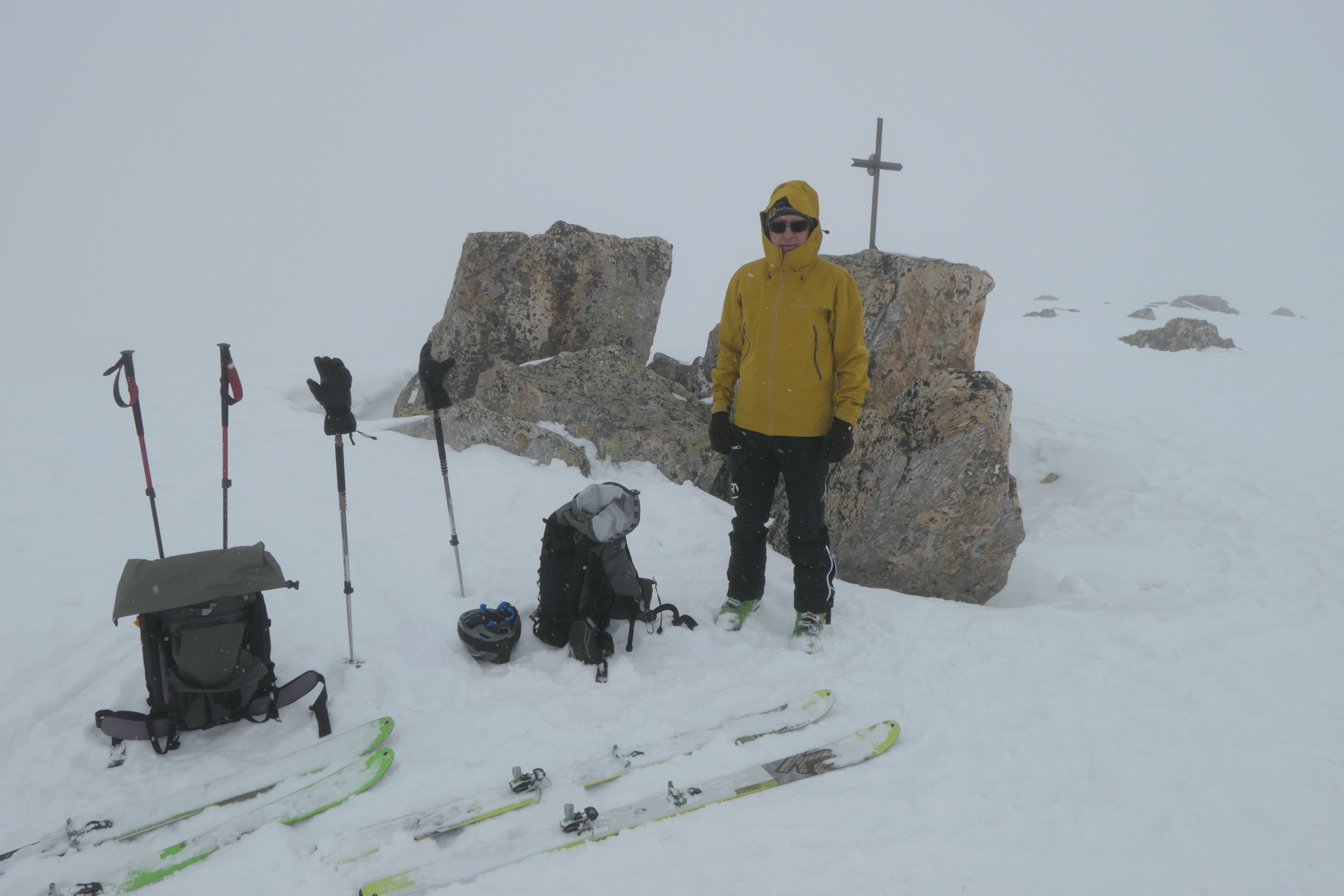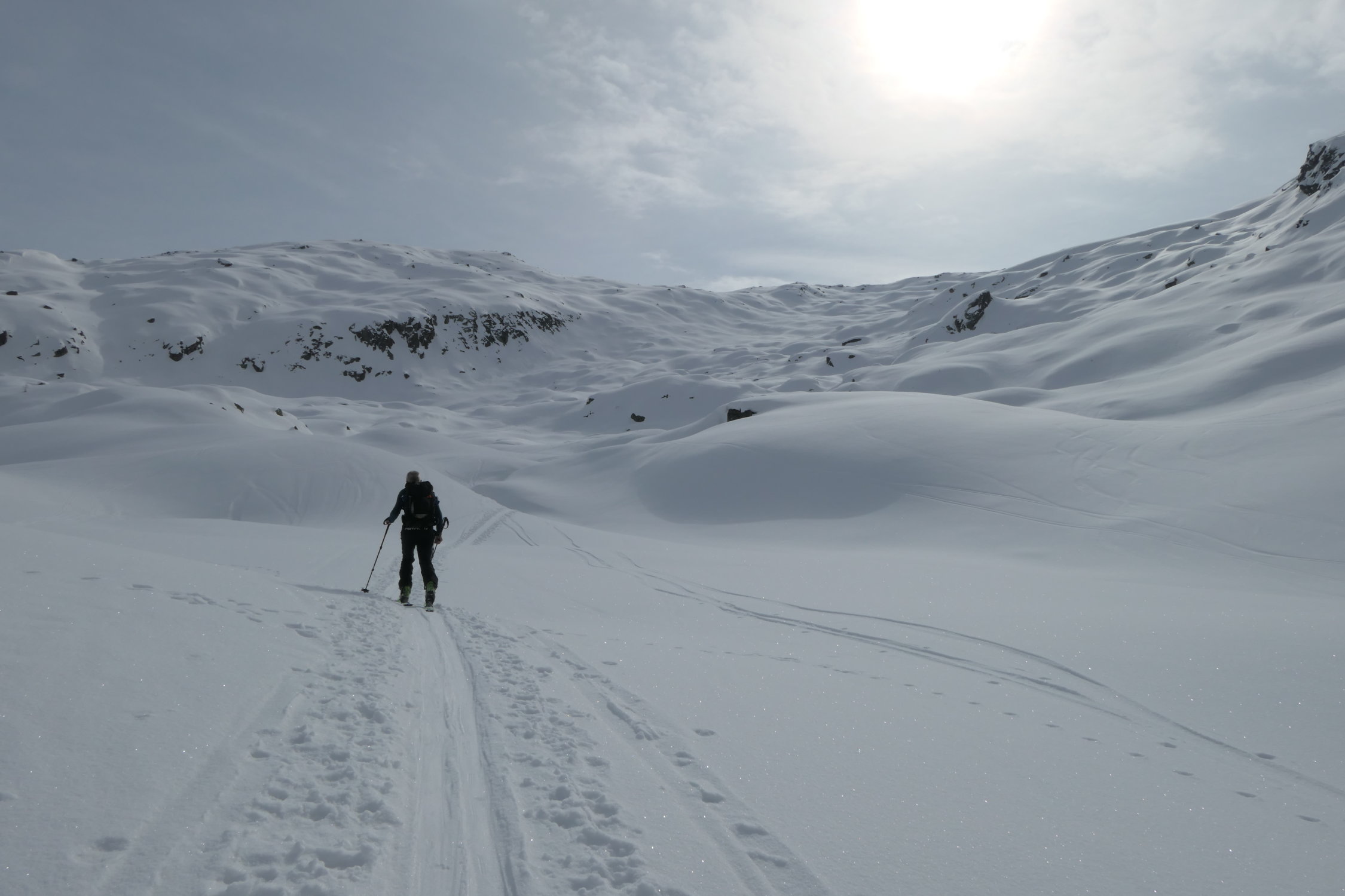 Leider kam schon auf dem Brudelhorn Nebel auf, der sich zwischendurch lichtete, aber leider etwas hartnäckig blieb. In der Abfahrt vom Teltschehorn via Chietal und Rittbächi mussten wir immer wieder auf bessere Sicht warten. Die Abfahrt war aber trotzdem wunderbar. Wir haben uns auf einen Bericht vom 8.03. gestützt, wo der letzte Teil dieser Abfahrt so beschrieben wurde: "Die Abfahrt über Rittbächi ging gut". Unten wird diese Abfahrt aber sehr steil. Da bei uns der Schnee aufgrund der fehlenden Sonneneinstrahlung sehr hart war, hätte hier ein Sturz fatal enden können... Wir sind daher das letzte Stück zu Fuss abgestiegen, weil uns das Risiko zu gross war.