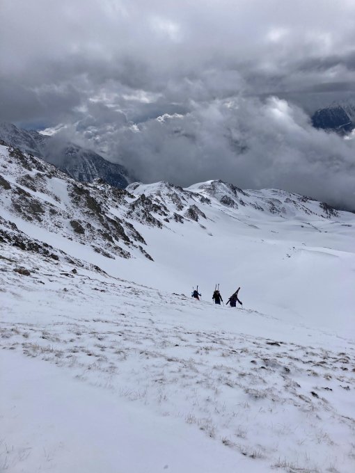 Am Gipfelhang (Südexpo) rutschige Angelegenheit ("Dust on Crust"),daher irgendwann ski auf den Rücken geschnallt.