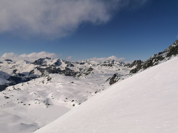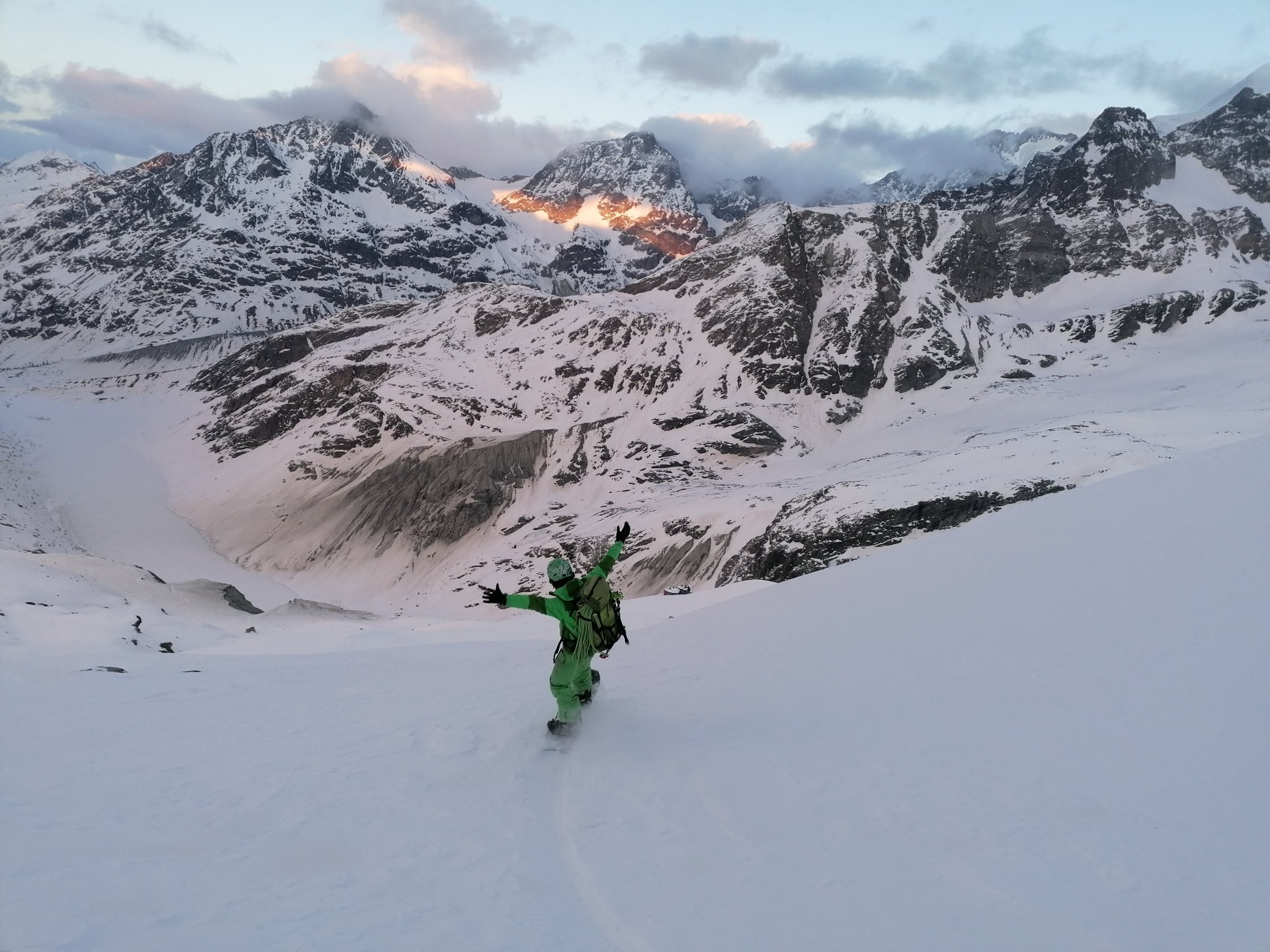 Abfahrtscouloir zu Coaz Hütte kurz steil 40-45°auf 20m. Schnee ist aber griffig. Bis zu Hütte dann Press pulver und Bruchharsch. Mit dem Board ging es gut zu fahren.