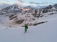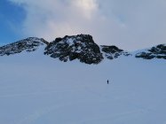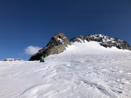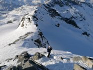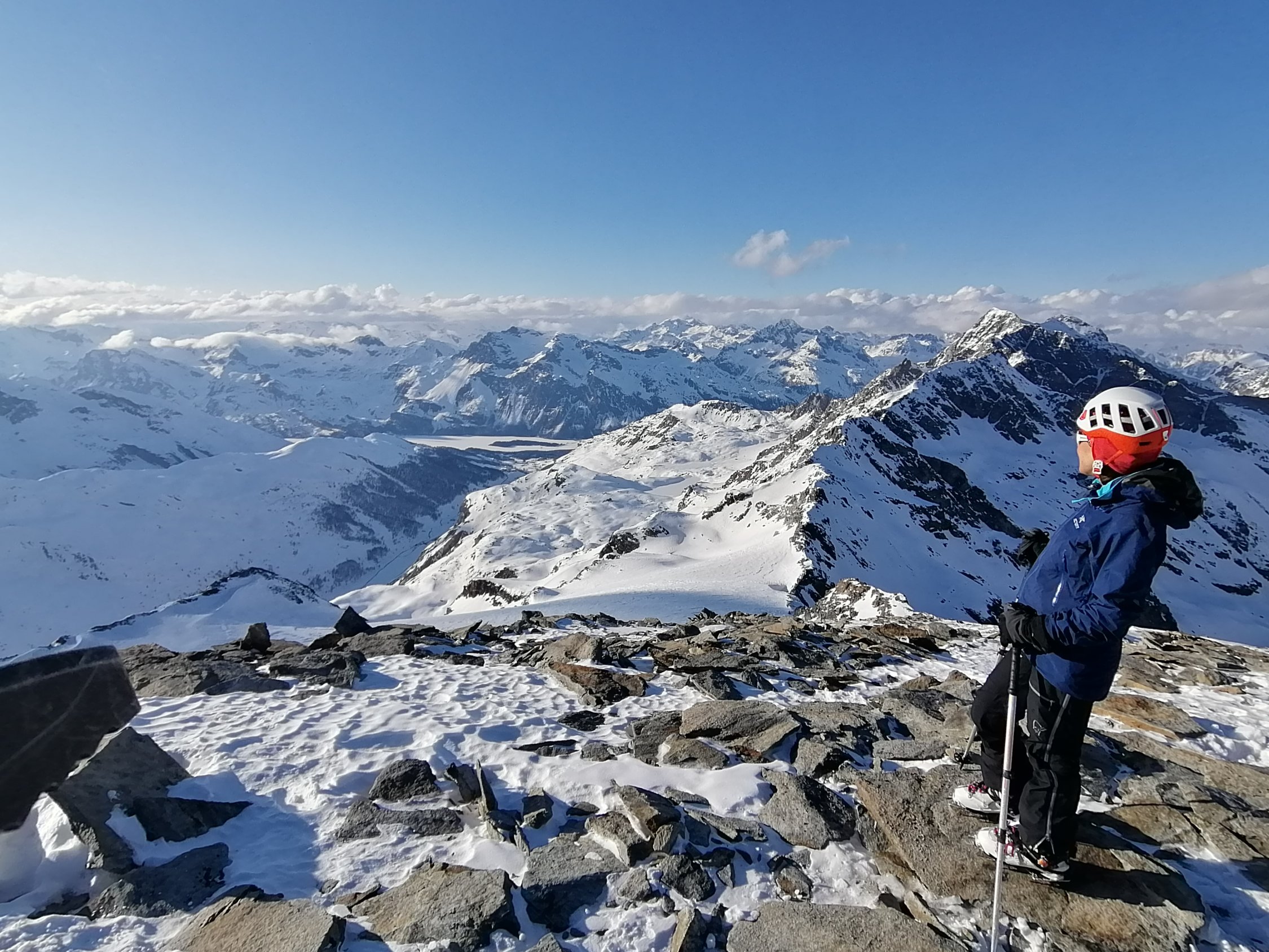 Noch dem Skidepot zum Gipfel zwischen den Felsen Hartschnee Steigeisen hilfreich - vor allem dann im Abstieg. Am Gipfel um 16:30, fantastische Sicht ins Bernina Gebiet un ins VELTLIN und Bergell.