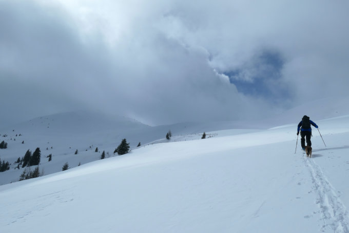 Wettervorhersage Meteo blue war präzise, erlaubte uns späten Start (12.00) und raschen Aufstieg (1:30) in guter Spur, Merci, und bescherte sonnige Abschnitte, bevor es am Nachmittag wieder zuzog.