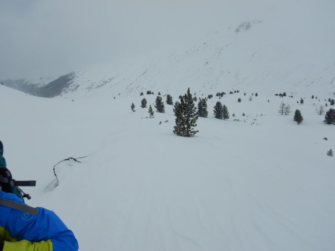 Wegen stürmischen Winden ist die Talseite von Gorihorn- Jörihorn komplett abgeblasen bis auf den harten Altschnee, abwechselnd mit ausgeapertenden Stellen. Der Pulverschnee der letzten Tagen ist vollständig verfrachtet teilweise auf die andere Talseite vom Sentisch Horn, wo in den Mulden geschichteter, instabiler Treibschnee liegt zwischen abgebalsenen Kämmen. Beim Aufstieg schon in flachen Zonen Wumm Geräusche und Rissbildungen in der Schneedecke. Deshalb sind wir vor dem ersten Hang knapp unter 30° Hangneigung umgekehrt.
