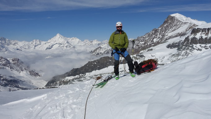 Nach der kurzen Abfahrt vom Pass unter den ersten Felssporn wird der Schnee wieder lockerer und der Wind lässt nach. Zeit die grandiose Aussicht auf Weisshorn, Zinalrothorn, Dent Blanche und Matterhorn zu geniessen. Zermatt liegt unter einer Wolkendecke. Das ist schön, weil dann weniger Touris in Helikoptern umherfliegen.