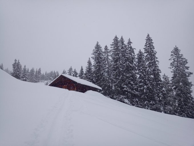 Beim Start -1°C um 10 Uhr. Die Tour ist durchgehend mit Schii Begeh- und Befahrbar. Schneefall während der ganzen Tour. Ca. 20 cm Neuschnee im Tal ansteigend auf ca. 40 cm in der Höhe.