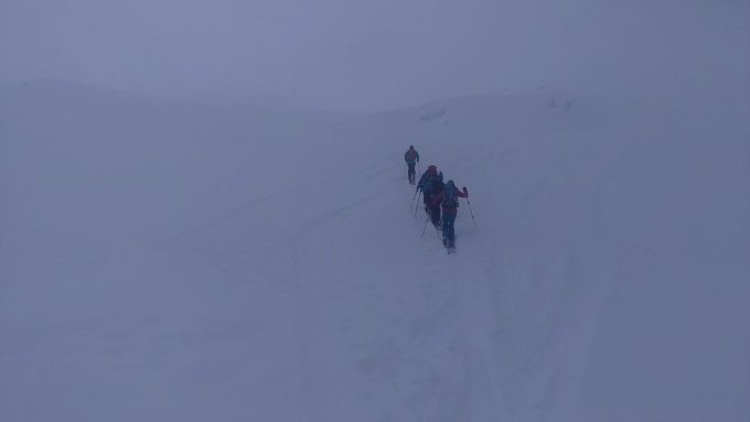 Um 8 Uhr bei Schneefall gestartet und es hat praktisch bis zum Gipfel immer wieder geschneit. Die vorhandene Spur (danke den Frühaufsteher) war teilweise schon wieder eingeschneit. Zwischendurch hat sich die Sonne gezeigt und dann rechtzeitig für die Abfahrt hat sich die Sicht merklich verbessert. Was für ein Wetterglück!!!