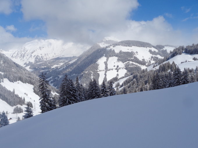 Kann weiterhin noch gut gemacht werden. Die Bergwelt um Jaun ist ausgezeichnet eingeschneit. Diese Kombination Brendelspitz und Hundsrügg ergibt 1620 Hoehenmeter.