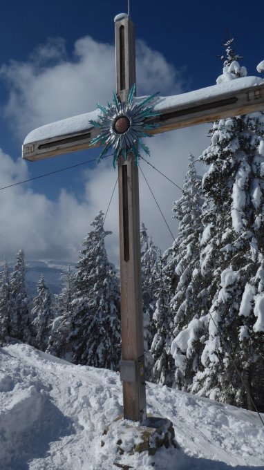Großes neues Gipfelkreuz. Frequenz um 10 Uhr am Gipfel überschaubar.