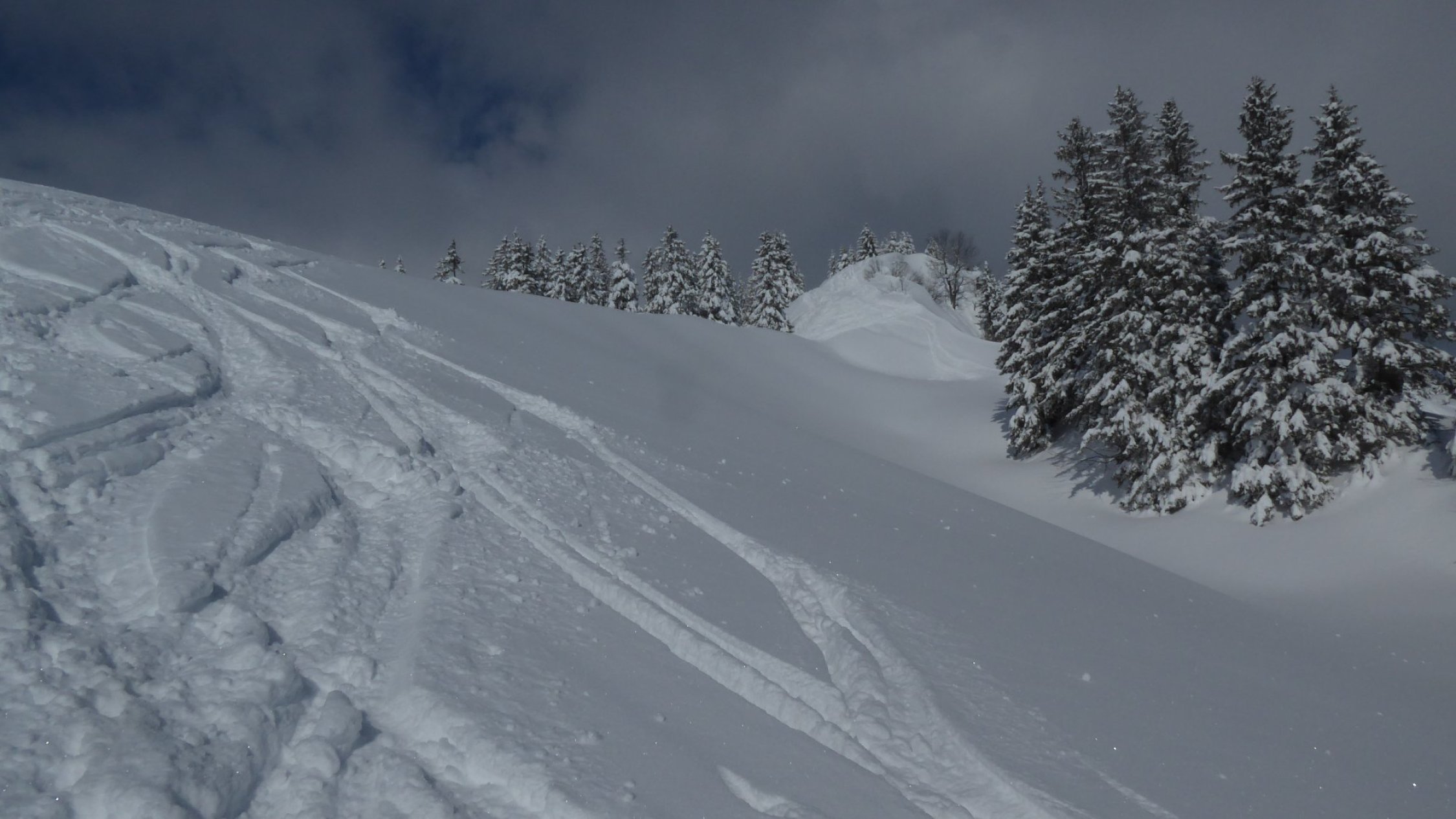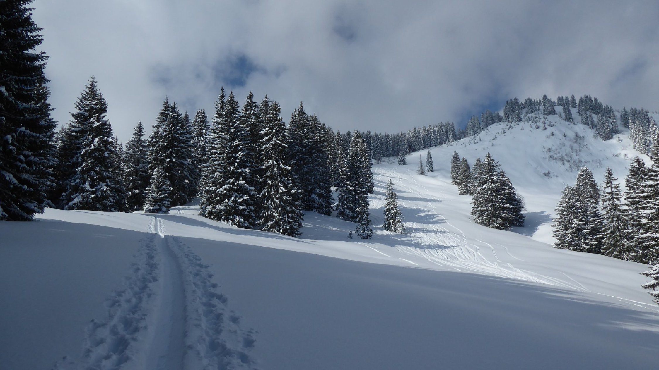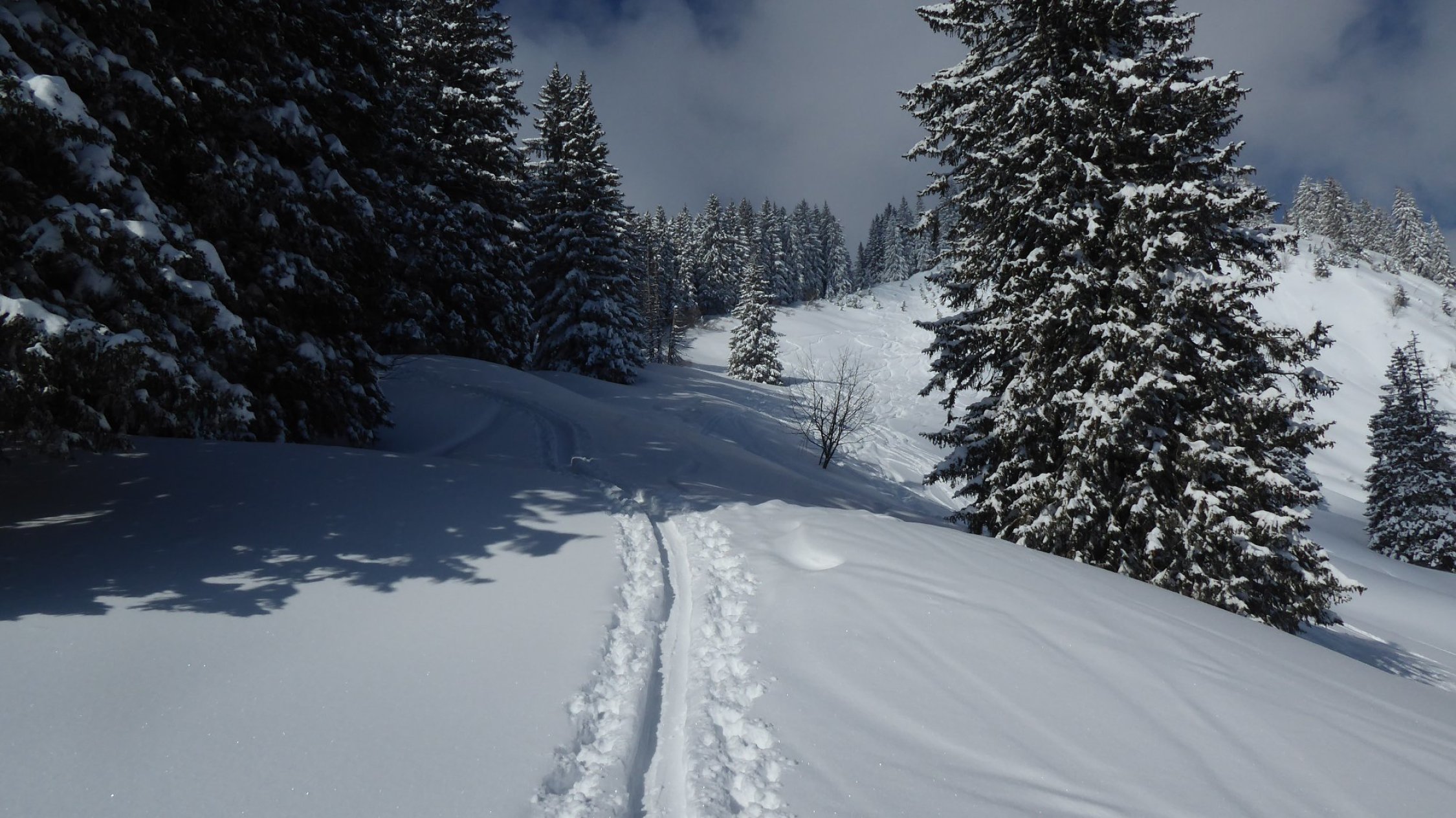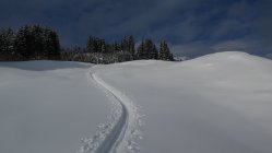 Start um 8 Uhr bei Wolkenlosem Himmel und noch frostiger Temperatur. Verhältnisse wie im Hochwinter. Schon viel eingefahren aber es hatte noch genügend Platz für unbeschwerte Schwünge. Forstweg üppig eingeschneit, Abfahrt bis runter möglich.